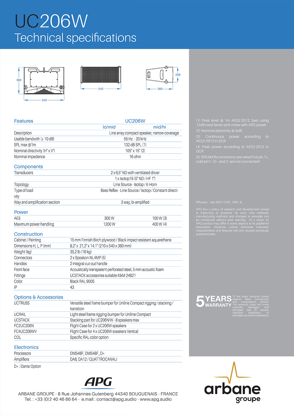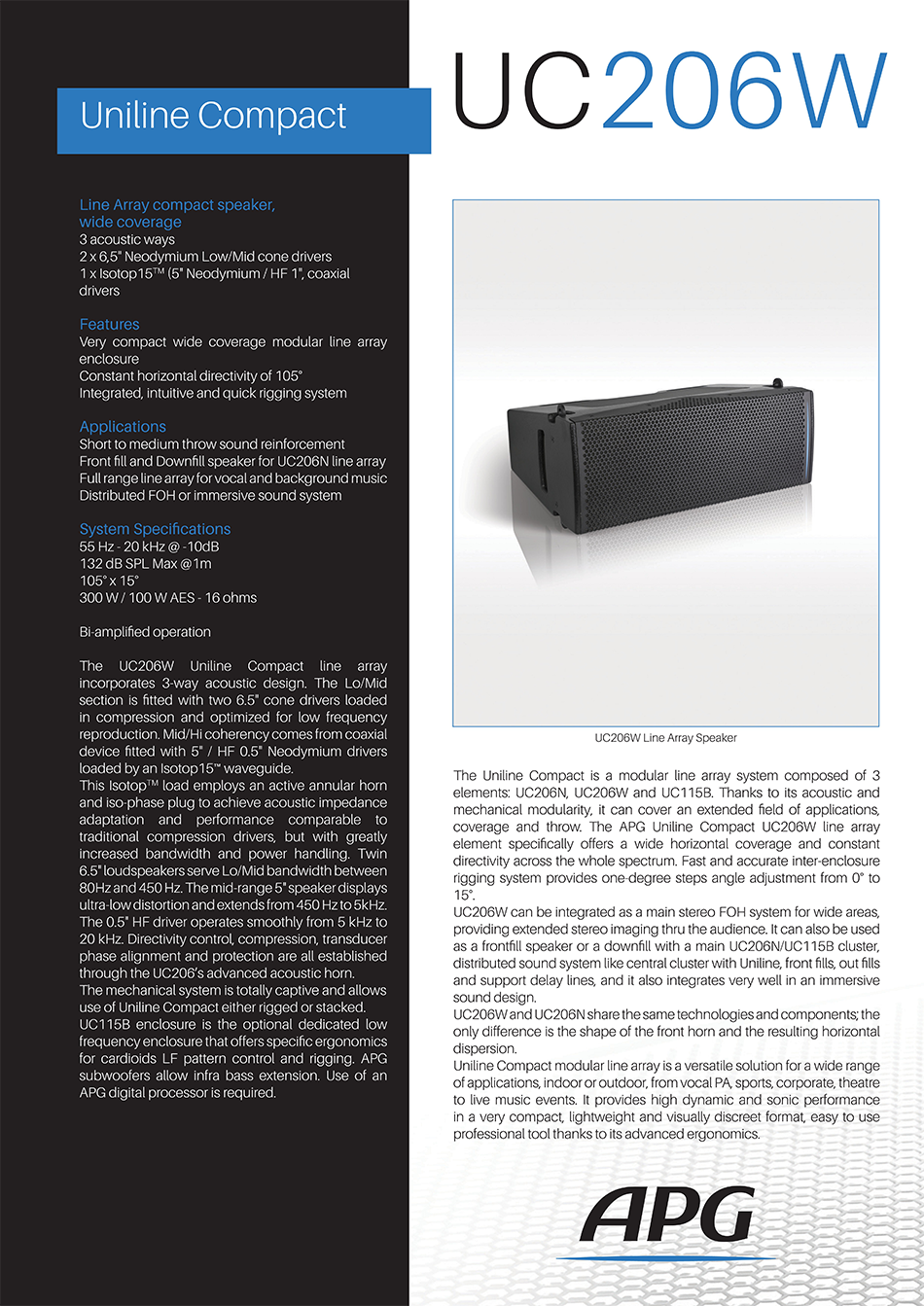 UC206W는 APG의 유니라인 컴팩트(Uniline Compact) 시리즈에 속하는 고성능 3-way 라인 어레이 스피커입니다. UC206N과 동일하게 매우 컴팩트하고 가벼운 인클로저로 설계되어 설치의 유연성을 극대화하는 동시에, 넓은 수평 커버리지를 제공하도록 최적화되었습니다. 음향 구성은 UC206N과 마찬가지로 2개의 6.5인치 네오디뮴 콘 드라이버를 압축 로드 방식으로 사용하여 저음역과 중저음역을 처리합니다. 중고음역은 APG의 독점 기술인 Isotop™ 도파관에 장착된 5인치 미드레인지 드라이버와 1인치 고주파 드라이버의 동축 구성으로 이루어져 있습니다. UC206W는청중이 넓게 분포되어 있는 근거리 환경이나 필인(fill-in) 용도로 사용하기에 이상적입니다.