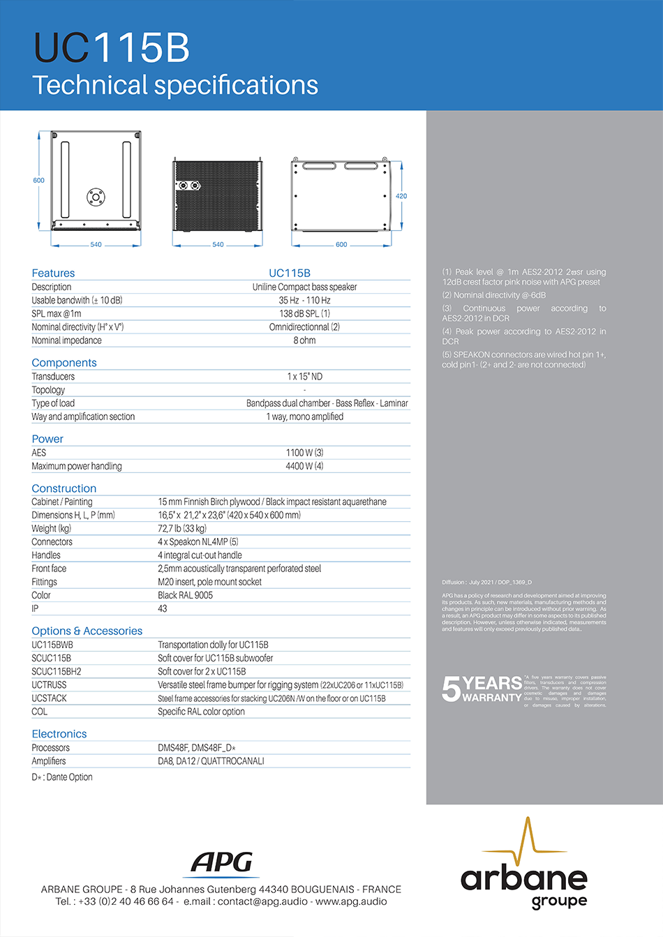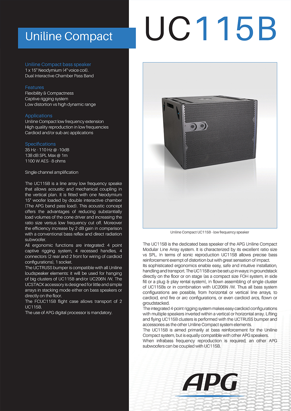 UC115B는 유니라인 컴팩트 시리즈를 위한 고성능 모듈형 서브우퍼로, 라인 어레이 시스템의 저주파수 응답을 완벽하게 보강하기 위해 설계되었습니다. 컴팩트한 크기에서도 깊고 강력한 저음을 재생할 수 있도록,15인치 네오디뮴 트랜스듀서를 베이스 리플렉스 방식으로 채택하고 있습니다.또한 자체적으로 완전한 저주파수 보강 기능을 수행할 뿐만 아니라, 물리적으로 UC206 라인 어레이 모듈과 완벽하게 결합되도록 설계되었습니다. 특허받은 크로스 리깅(Cross Rigging) 시스템을 통해 UC115B 캐비닛 위에 UC206 모듈을 플라잉하거나 스태킹하여 안정적으로 어레이 시스템을 구축할 수 있게 합니다. 최대 138dB SPL의 강력한 출력을 제공하며 주파수 응답은 38Hz까지 확장되어 UC206 모듈이 재생하지 못하는 깊은 초저역대까지 커버합니다.