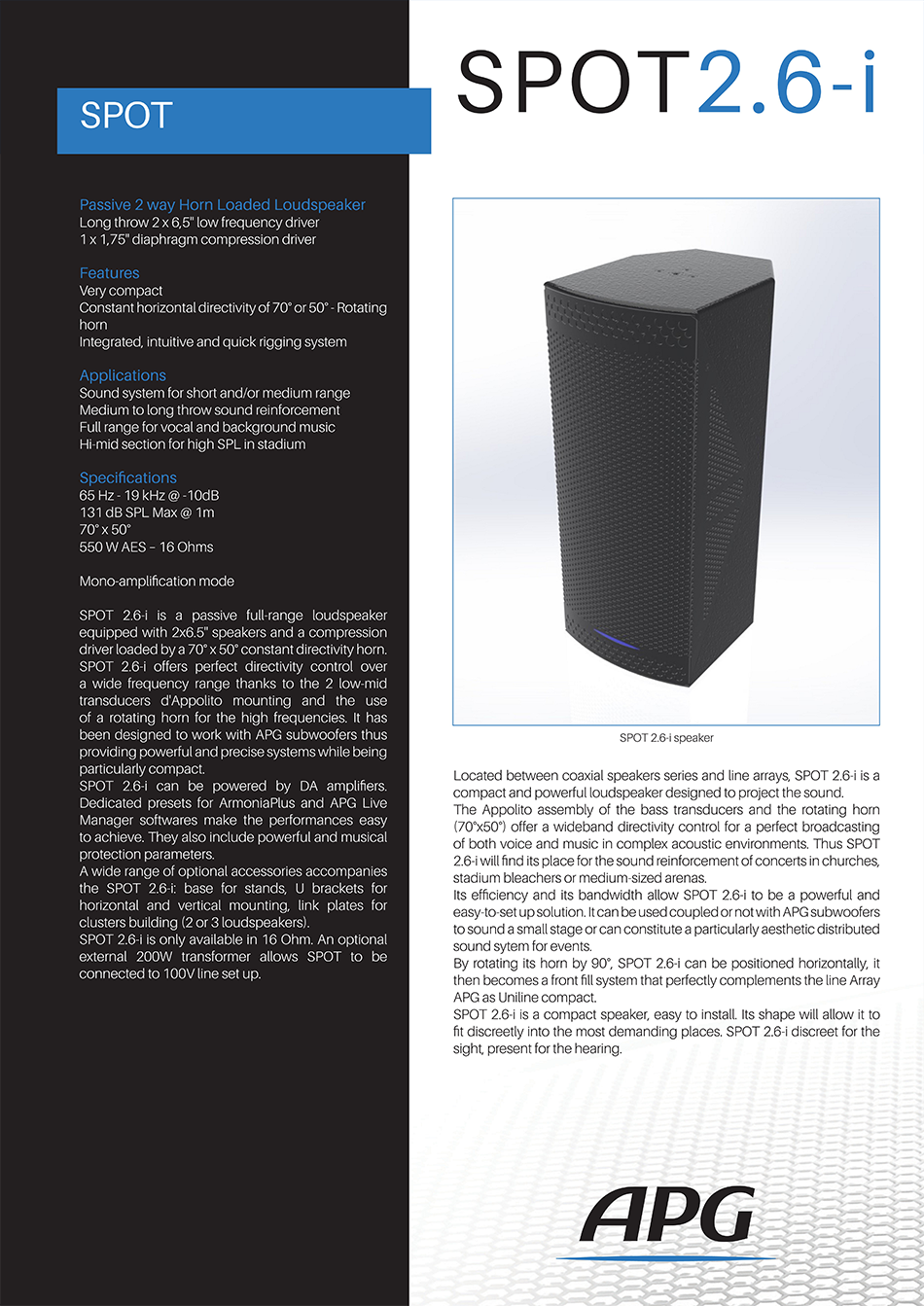 SPOT 2.6-i는 Canali앰프와 DA 앰프와 매칭되며 Armonia Plus 또는 APG Live Manager의 사용으로 최상의 성능을 구현할 수 있습니다.