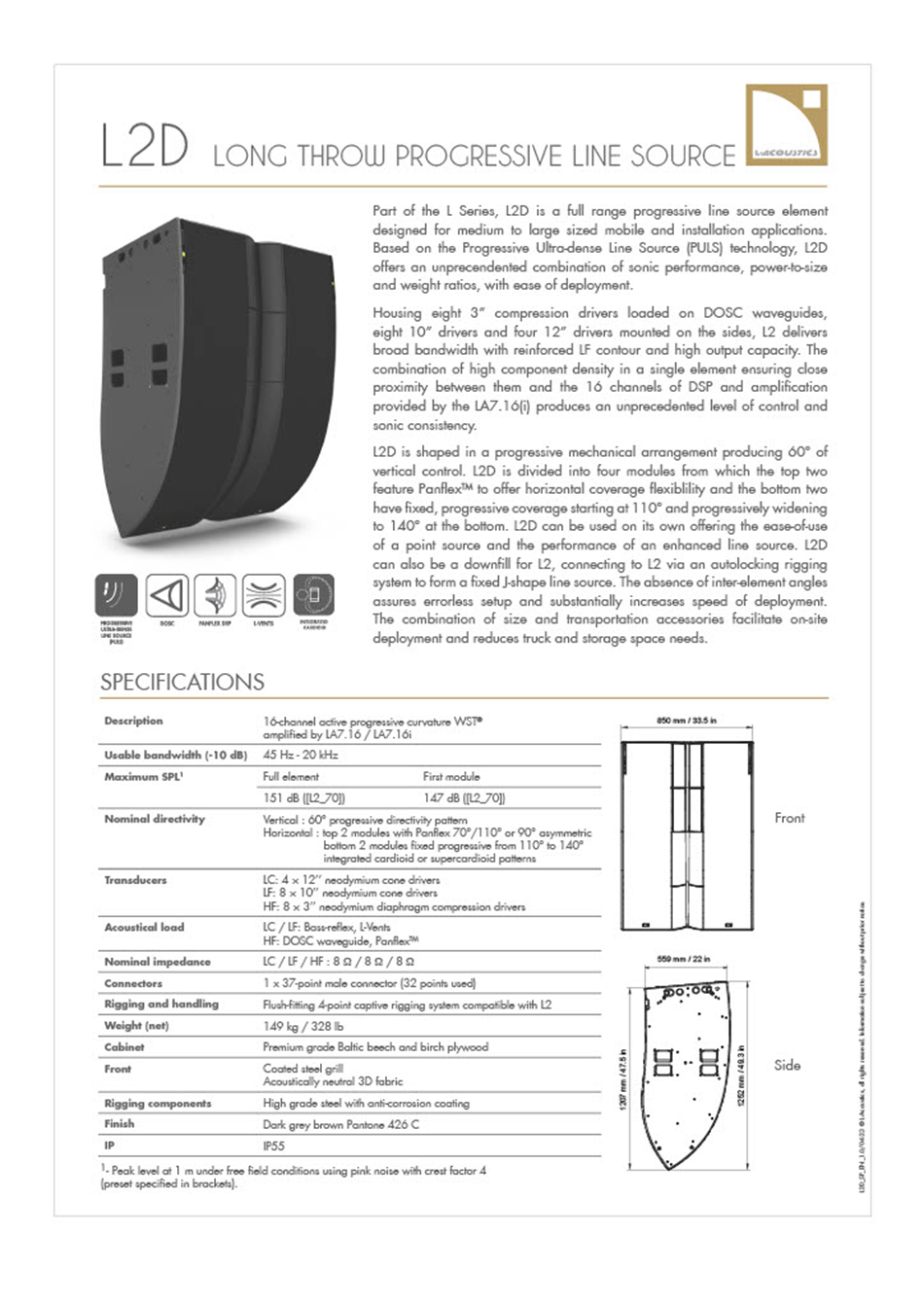 L2와 L2D는 중대형 규모의 이동식(Touring) 및 고정 설치(Installation) 애플리케이션을 위해 특별히 설계된 풀레인지 라인 소스 엘리먼트입니다. L2 시스템은 유연하고 강력한 성능을 제공하여 광범위한 청중을 만족시킬 수 있습니다. 표준 스테레오 구성으로는 약 1,200명에서 최대 12,000명의 청중을 커버할 수 있으며, L-Acoustics의 몰입형 사운드 기술인 L-ISA 구성을 활용할 경우,  2,500명에서 최대 25,000명까지 확장하여 커버할 수 있습니다.또한  L-Acoustics의 특허 기술인 PULS (Progressive Ultra-dense Line Source) 기술을 기반으로 하여, 프로오디오 업계가 직면한 다양한 문제에 대한 혁신적인 해답을 제시합니다. PULS 기술 덕분에 L2 시스템은 타의 추종을 불허하는 음향 성능을 제공하는 동시에, 전례 없는 출력 대비 크기 및 무게 비율을 달성하여 운반 및 운용 효율을 극대화했습니다. 아울러, 탁월한 설치 용이성까지 갖추고 있어 현장 작업의 편의성도 크게 향상시켰습니다.