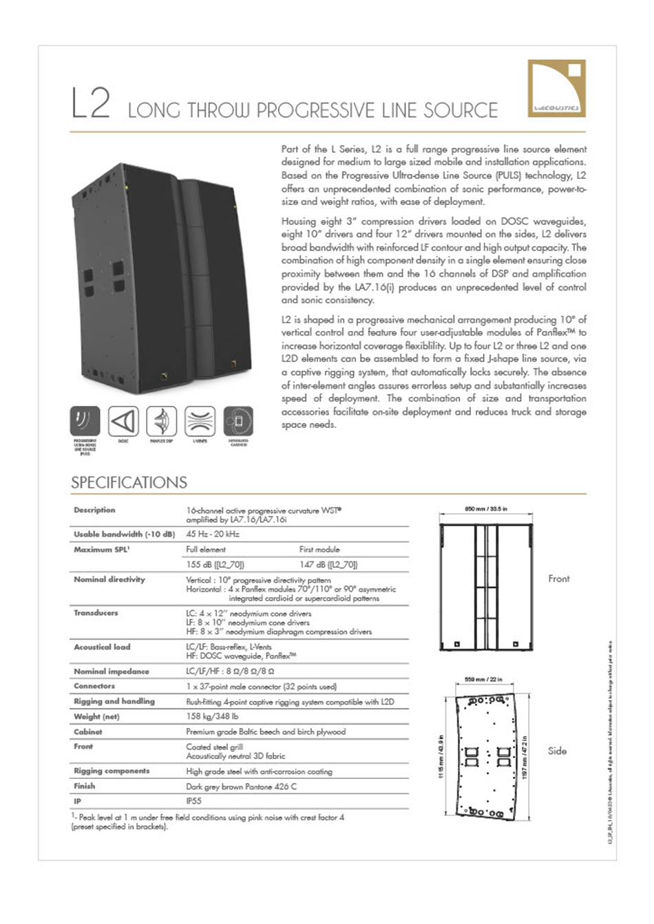 L2와 L2D는 중대형 규모의 이동식(Touring) 및 고정 설치(Installation) 애플리케이션을 위해 특별히 설계된 풀레인지 라인 소스 엘리먼트입니다. L2 시스템은 유연하고 강력한 성능을 제공하여 광범위한 청중을 만족시킬 수 있습니다. 표준 스테레오 구성으로는 약 1,200명에서 최대 12,000명의 청중을 커버할 수 있으며, L-Acoustics의 몰입형 사운드 기술인 L-ISA 구성을 활용할 경우, 2,500명에서 최대 25,000명까지 확장하여 커버할 수 있습니다.또한 L-Acoustics의 특허 기술인 PULS (Progressive Ultra-dense Line Source) 기술을 기반으로 하여, 프로오디오 업계가 직면한 다양한 문제에 대한 혁신적인 해답을 제시합니다. PULS 기술 덕분에 L2 시스템은 타의 추종을 불허하는 음향 성능을 제공하는 동시에, 전례 없는 출력 대비 크기 및 무게 비율을 달성하여 운반 및 운용 효율을 극대화했습니다. 아울러, 탁월한 설치 용이성까지 갖추고 있어 현장 작업의 편의성도 크게 향상시켰습니다.