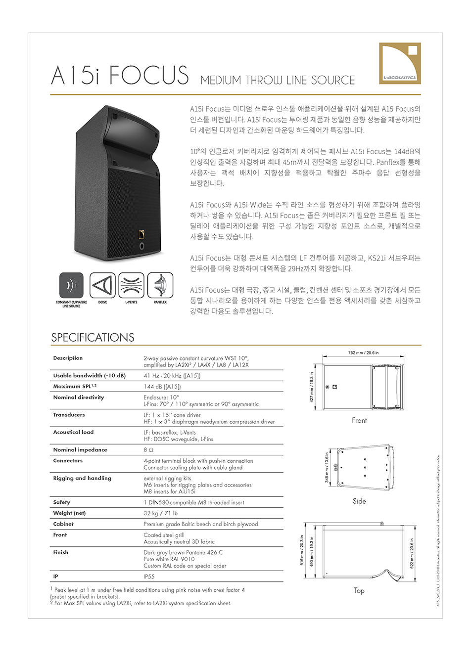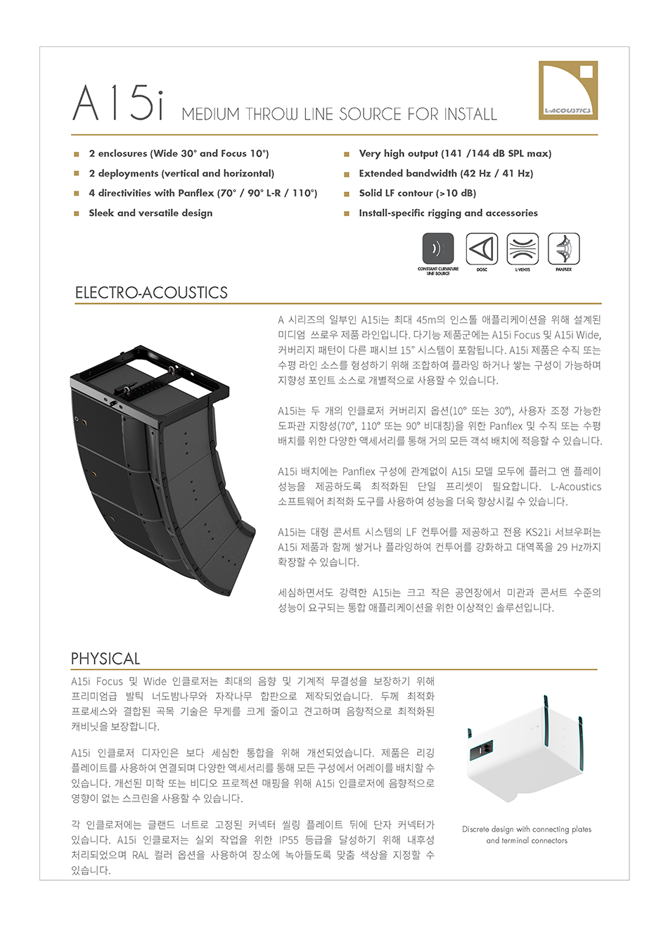 A15i는 두개의 인클로저 커버리지 옵션 (10° 또는 30°), 사용자 조정 가능한 도파관 지향성 (70°, 110° 또는 90° 비대칭)을위한 Panflex, 및 수직 또는 수평 배치를위한 다양한 액세서리를 통해 거의 모든 객석 배치에 적응할 수 있습니다.