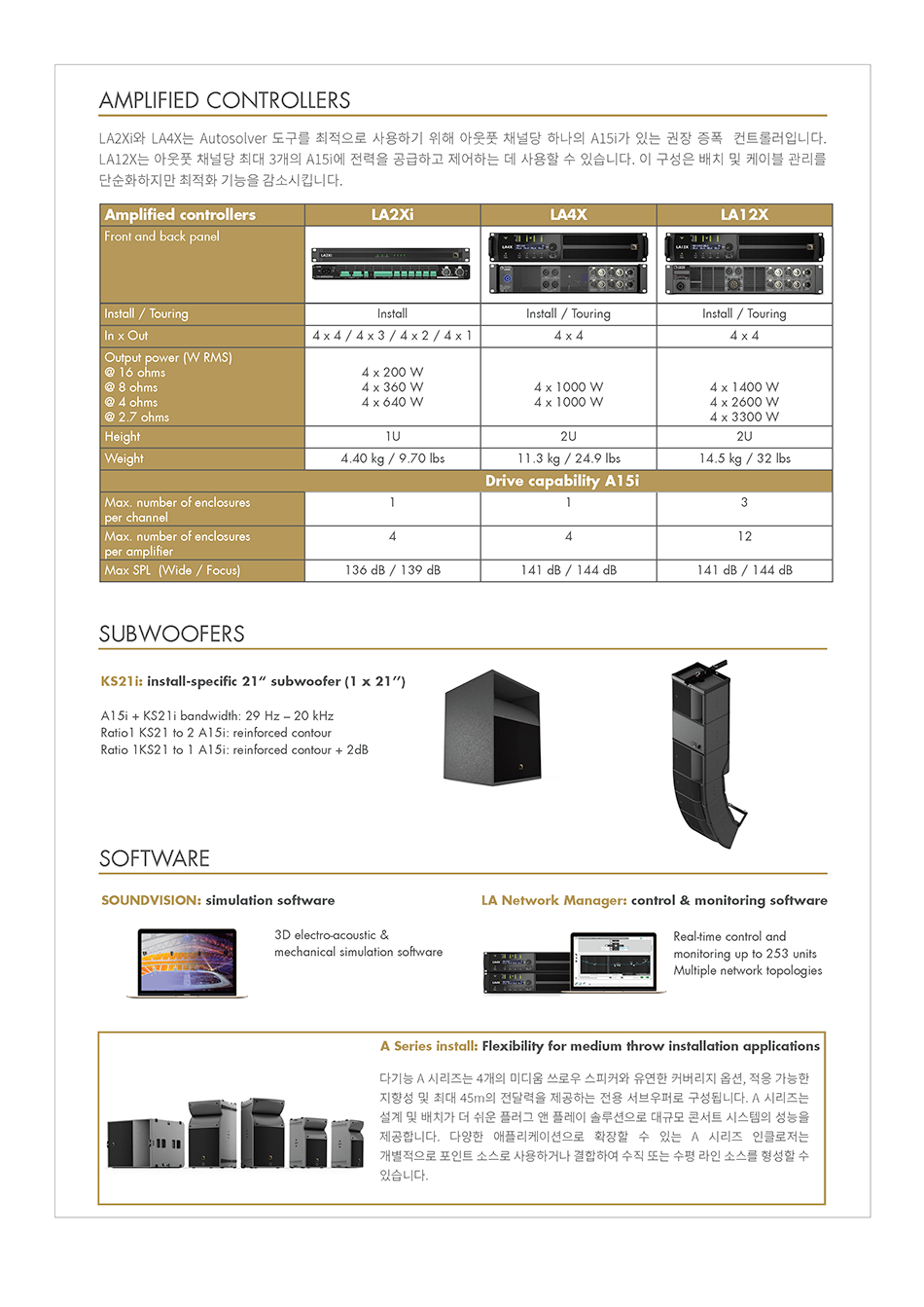 A15i는 대형 콘서트 시스템의 LF 윤곽을 제공하고 전용 KS21 서브우퍼는 A15i 제품과 함께 스택 하거나 플라잉하여 윤곽을 강화하고 대역폭을 29 Hz로 확장 할 수 있습니다.