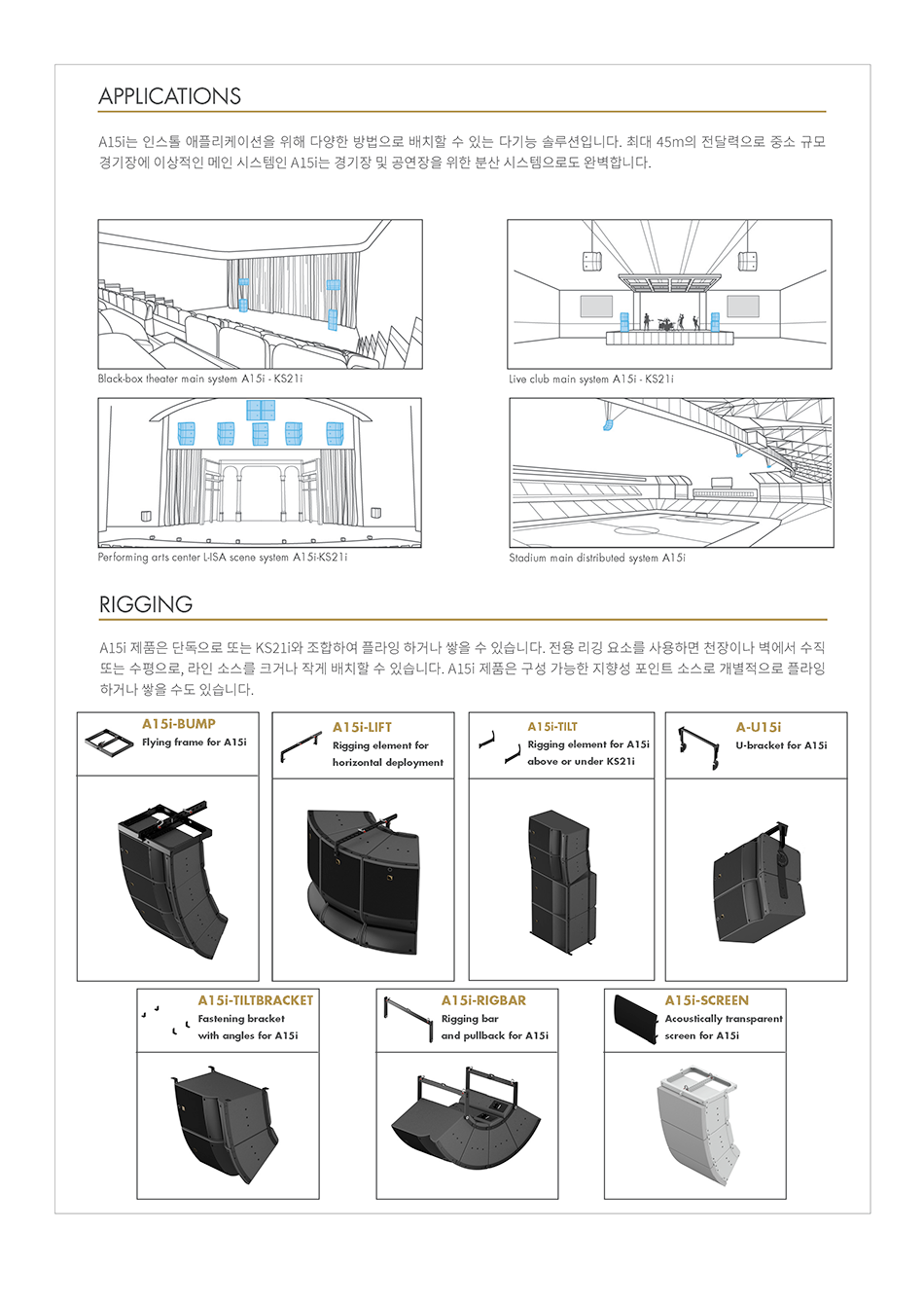 A 시리즈의 일부인 A15i는 최대 45m의 인스톨 애플리케이션을 위해 설계된 중거리 제품 라인입니다. 다기능 제품군에는 A15i Focus 및 A15i Wide, 커버리지 패턴이 다른 패시브 15” 시스템이 포함됩니다. A15i 제품은 수직 또는 수평 라인 소스를 형성하기 위해 조합으로 플라잉하거나 쌓는 구성이 가능하며 또는 지향성 포인트 소스로 개별적으로 사용할 수 있습니다.