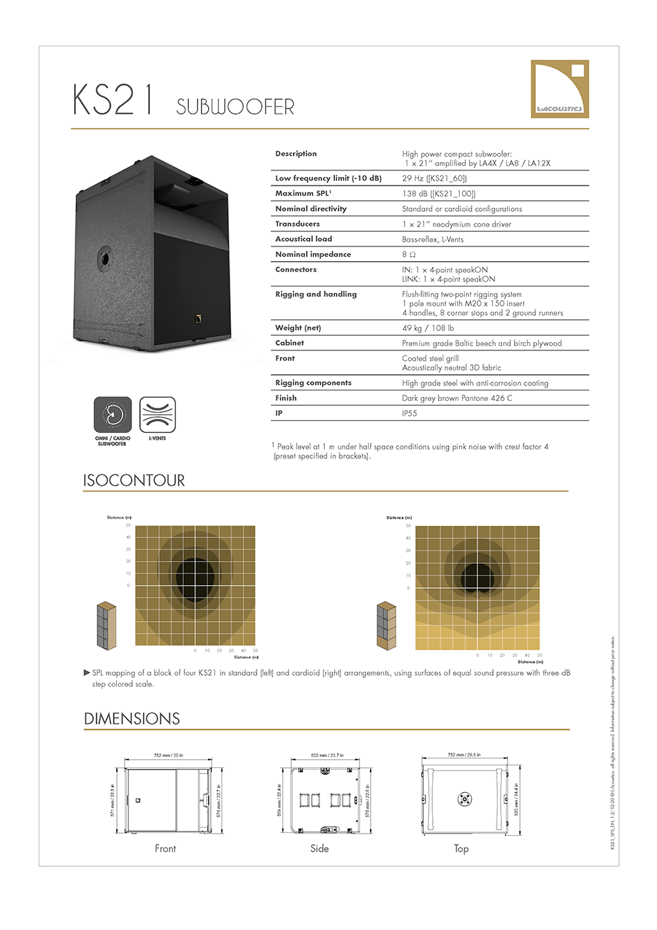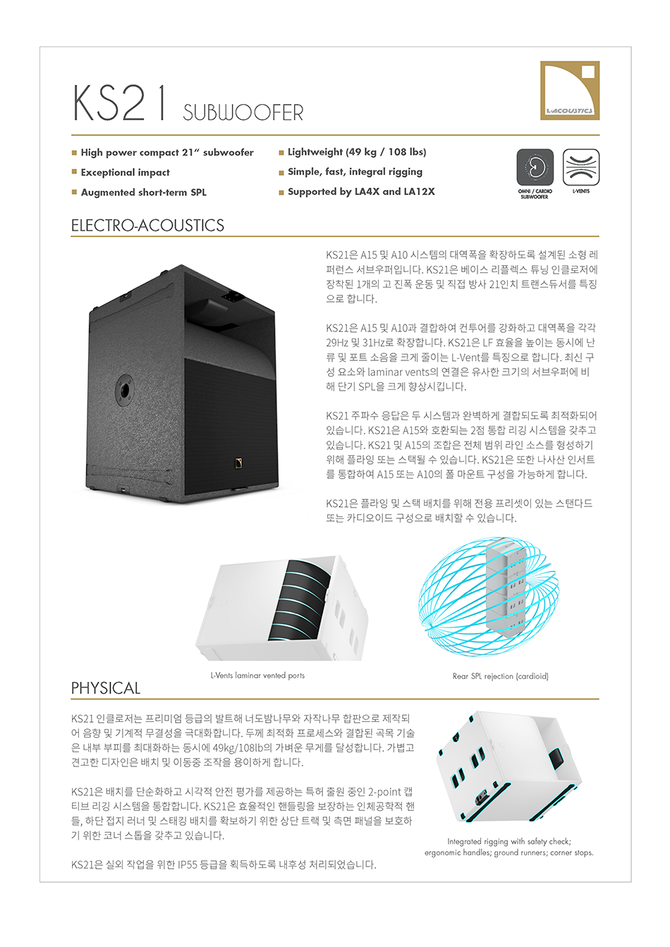 KS21은 다양한 커플링 및 LF컨투어 요구사항들을 충족시키도록 30Hz에서 60Hz 또는 100Hz까지 재생하며 LF 효율을 높이는 동시에 높은 레벨에서 난류 및 포트 노이즈를 대폭 감소시키는 L-Vent가 특징입니다.