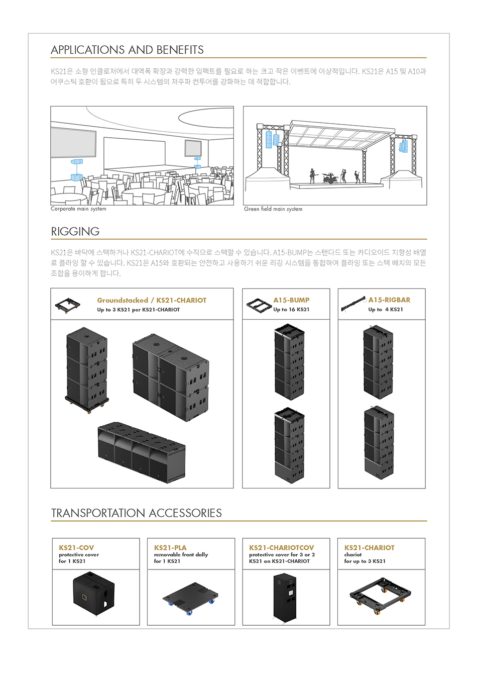 KS21은 ARCS A15 및 A10 시스템의 대역폭을 확장하도록 디자인 된 컴팩트 레퍼런스 서브우퍼 입니다. KS21은 베이스 리플렉스 튜닝 인클로저에, 높은 진폭과 직접 방사되는 1개의 21인치 트랜스듀서가 장착되어 있습니다.