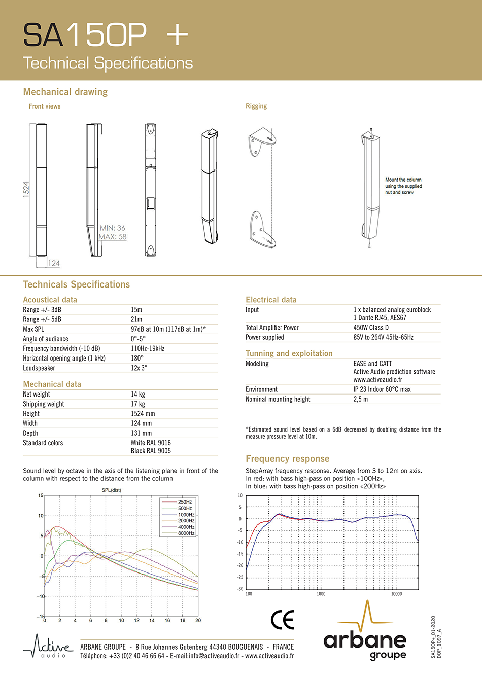 SA150P+는 중·소규모 고잔향 공간의 평면 좌석 구역을 위한 인스톨레이션용 디지털 빔 스티어링 컬럼 스피커입니다.