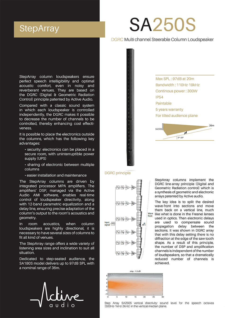 SA250S는 중·대규모 고잔향 공간의 경사 좌석을 위한 인스톨레이션용 디지털 빔 스티어링 컬럼 스피커입니다.
