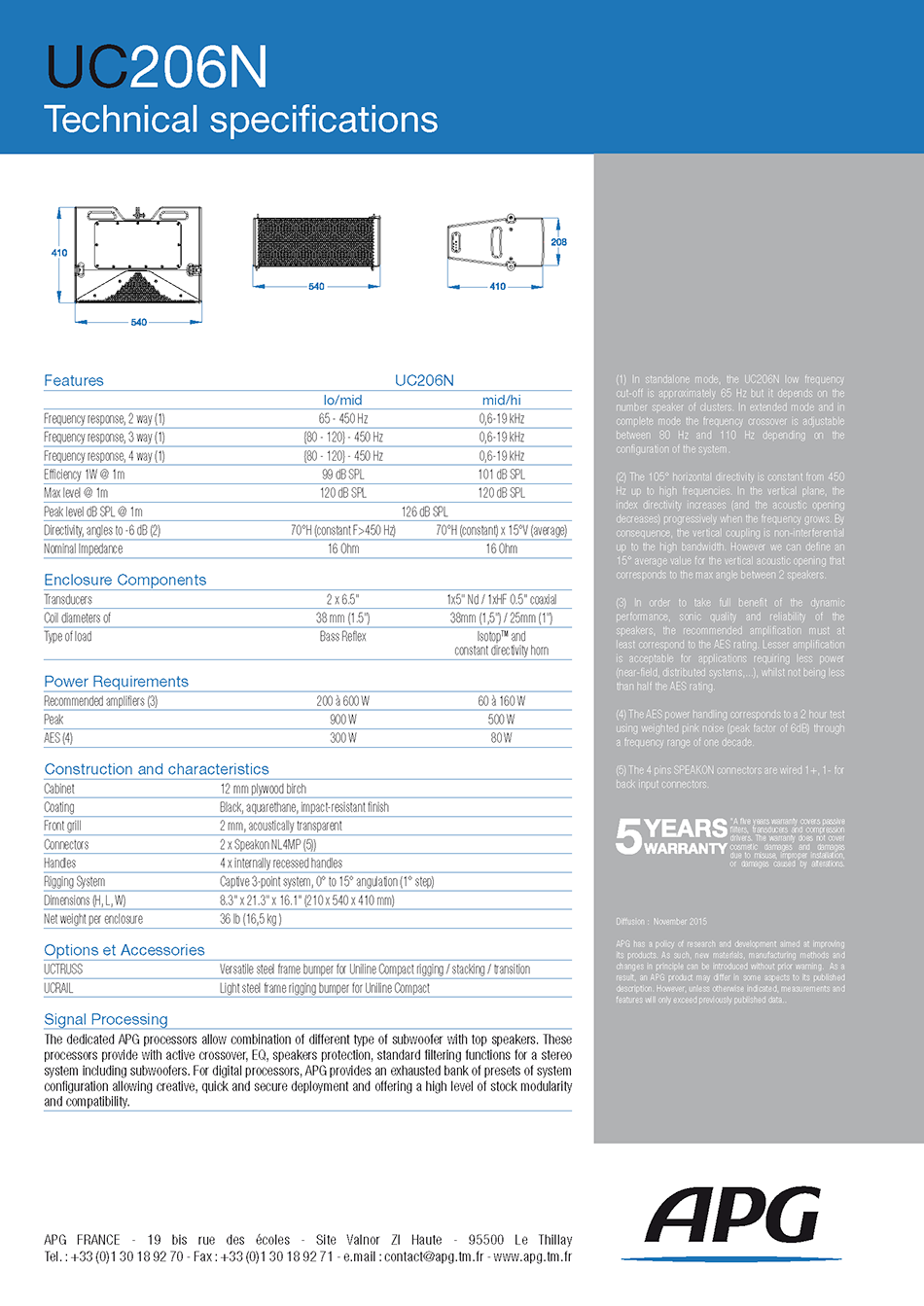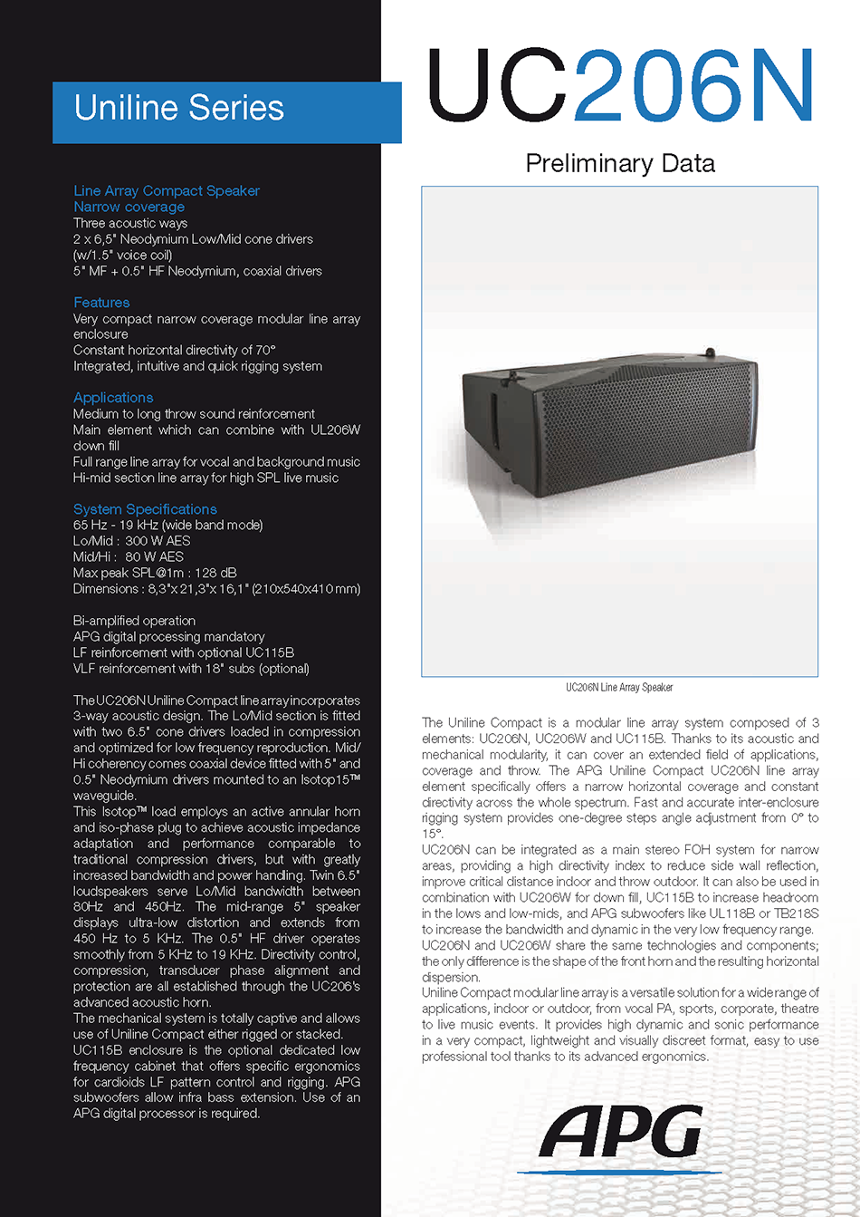 이 시스템은 최적의 성능과 보호를 위해 APG 디지털 프로세서의 사용이 필수적이며, Bi-amp 방식으로 구동되어 각 음역대별로 정교한 제어가 가능합니다. 설치 시에는 견고하게 통합된 플라잉 및 스태킹 시스템을 이용하여 다양한 환경에 쉽게 배치할 수 있으며, 전용 서브우퍼인 UC115B 등과 결합하여 전체 시스템의 저주파 응답을 확장할 수 있습니다. 최대 134dB SPL(피크)의 강력한 음압 레벨을 자랑하는 UC206N은 콘서트,전문공연장,종교시설등 실내외 전문 음향 환경에 이상적인 솔루션을 제공합니다.