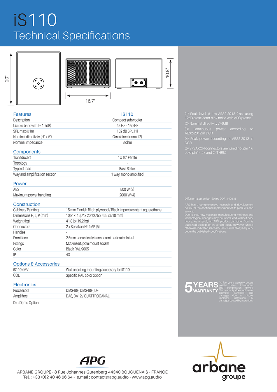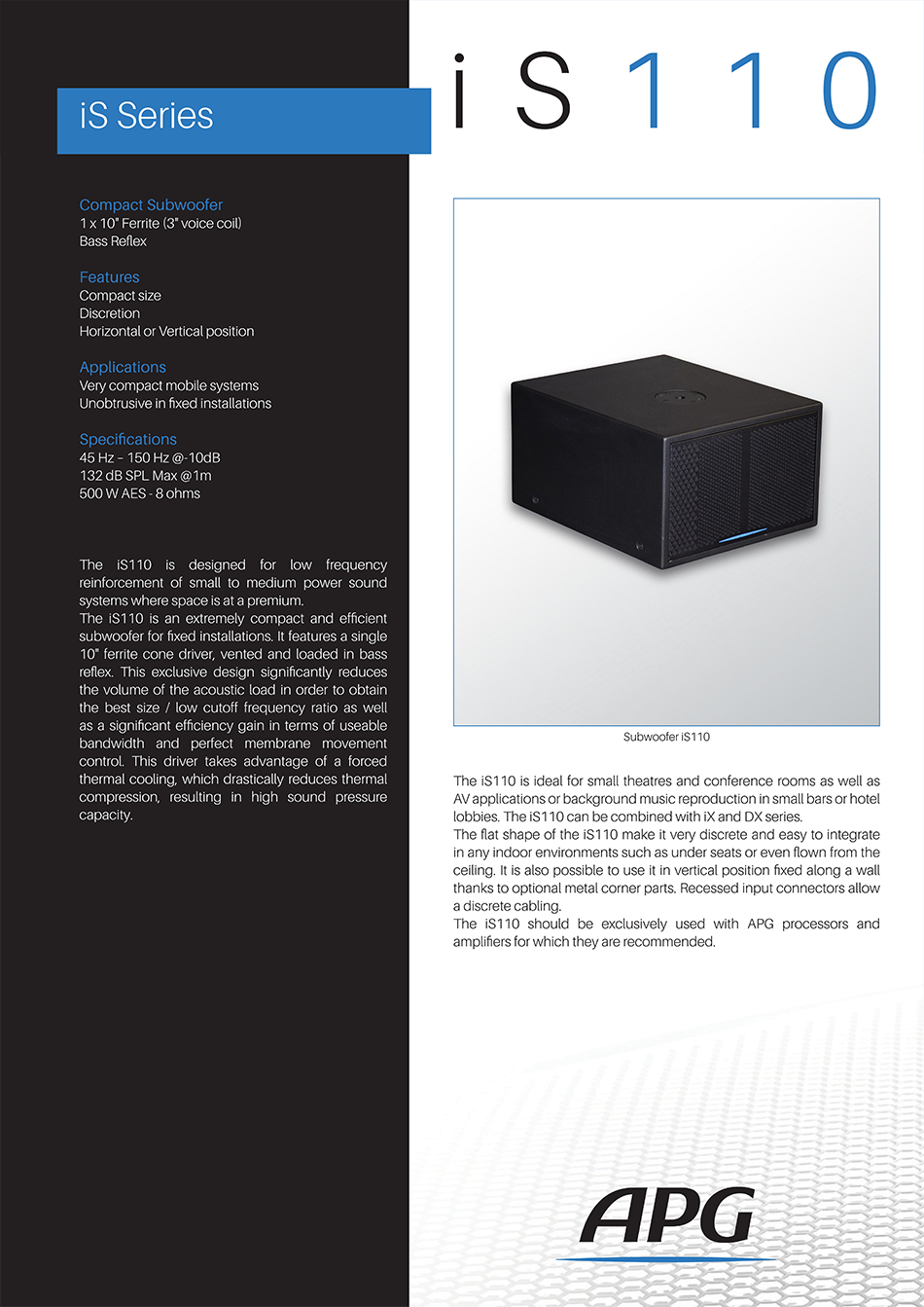 iS110은 중·소출력 사운드 시스템의 저역강화를 위한 인스톨레이션용 서브우퍼입니다.