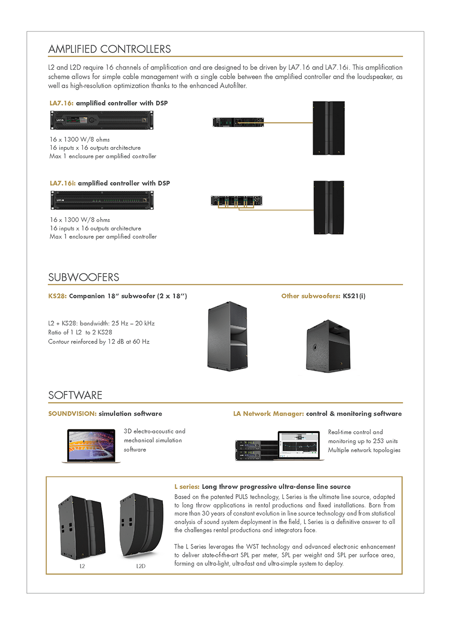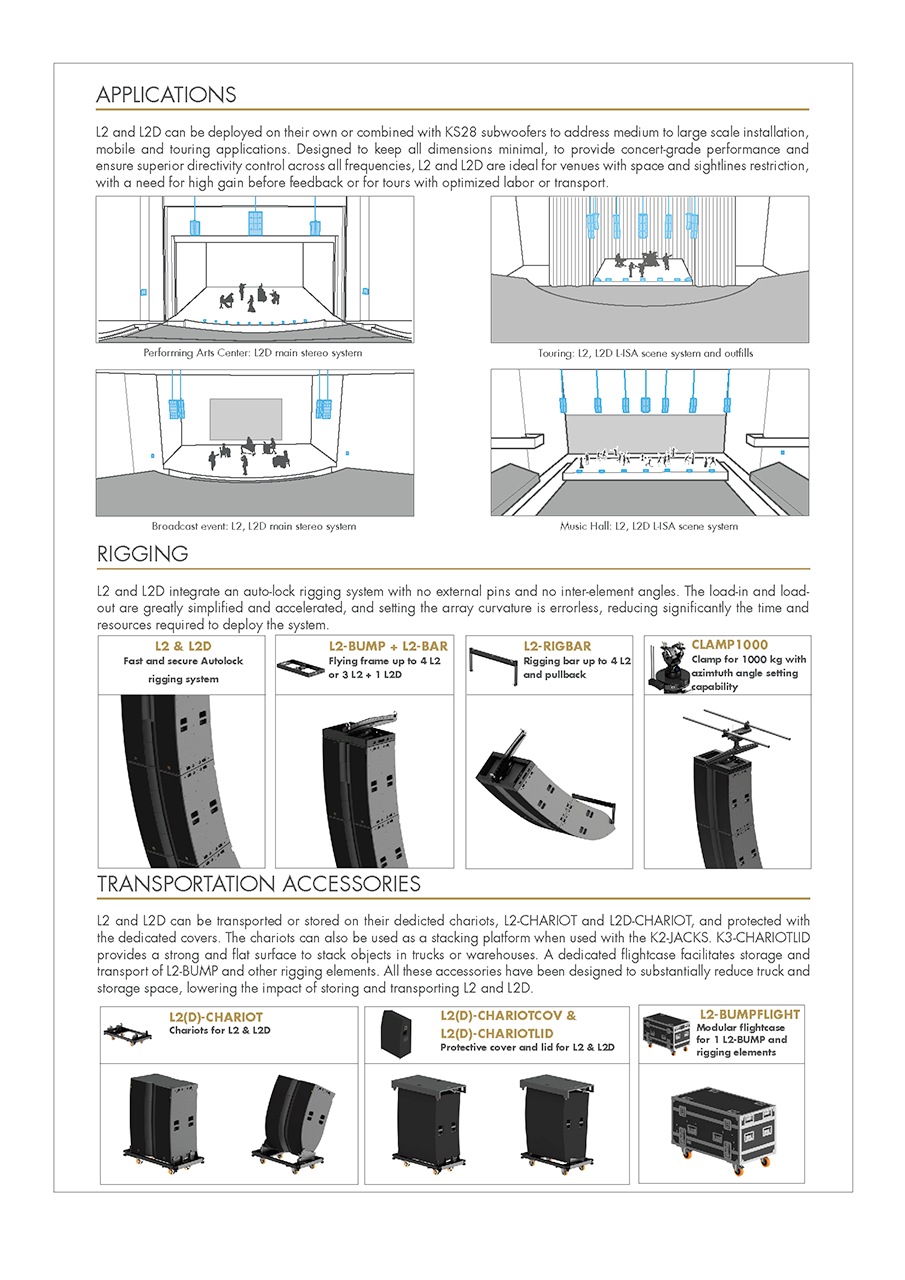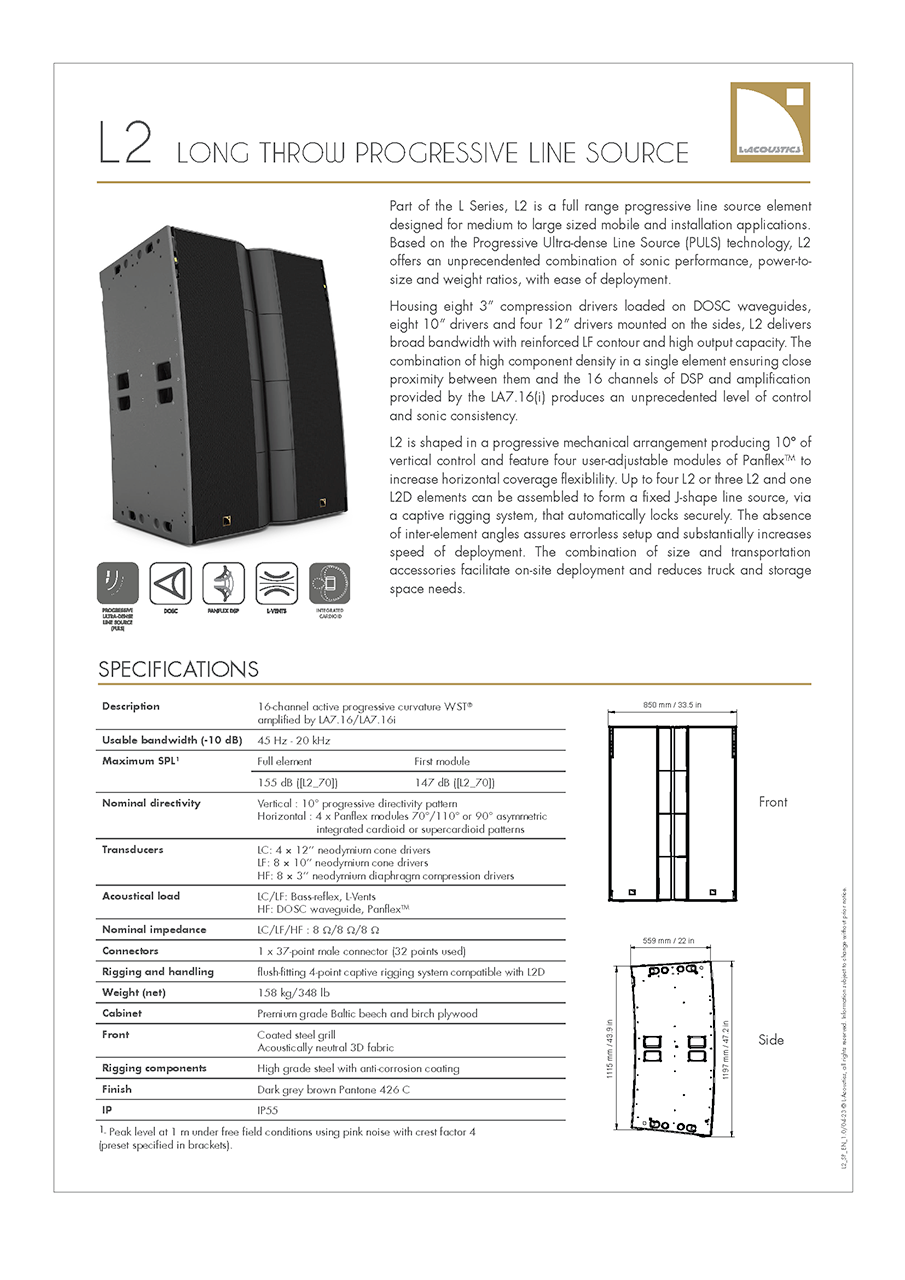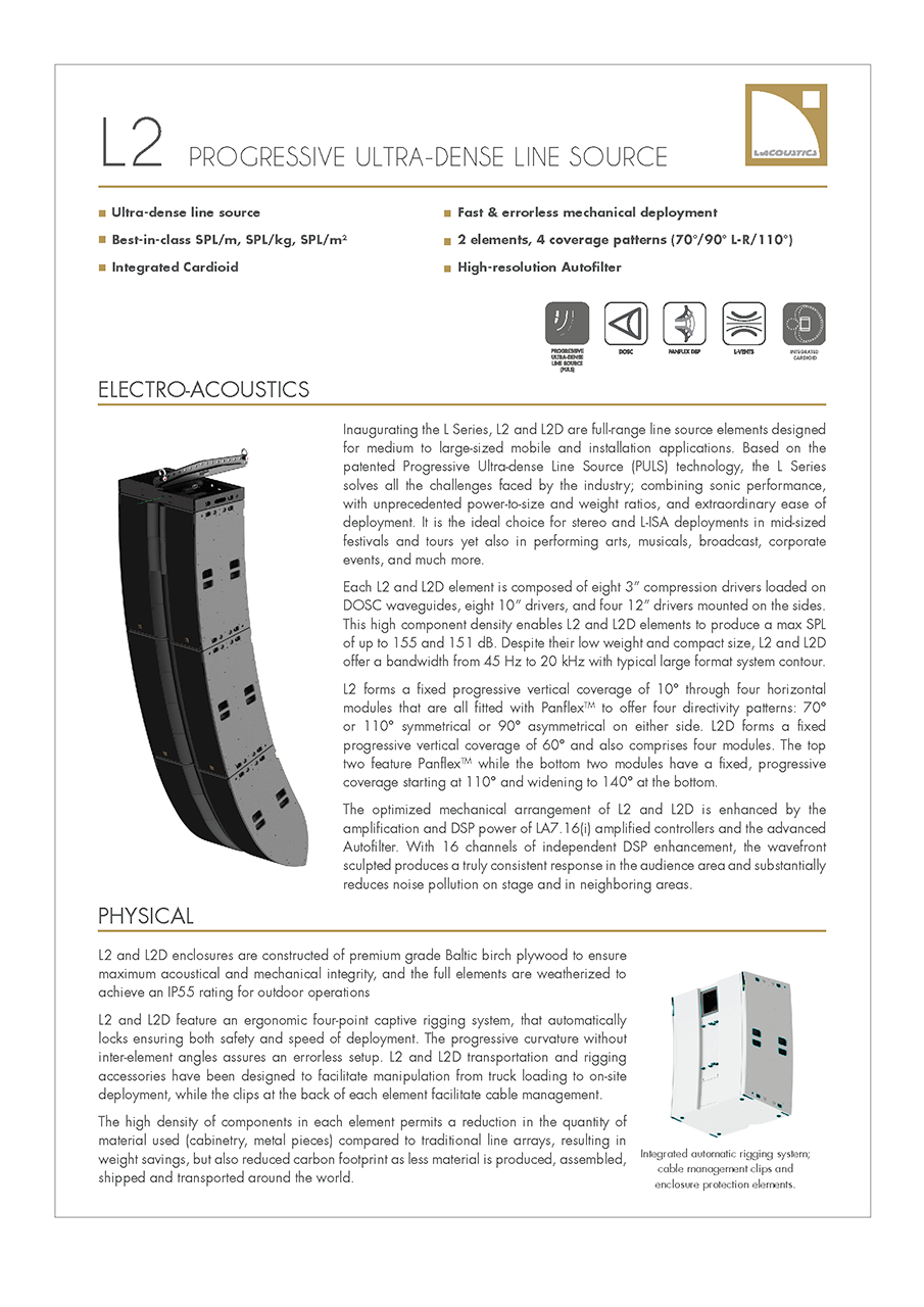 L2와 L2D는 중대형 규모의 이동식(Touring) 및 고정 설치(Installation) 애플리케이션을 위해 특별히 설계된 풀레인지 라인 소스 엘리먼트입니다. L2 시스템은 유연하고 강력한 성능을 제공하여 광범위한 청중을 만족시킬 수 있습니다. 표준 스테레오 구성으로는 약 1,200명에서 최대 12,000명의 청중을 커버할 수 있으며, L-Acoustics의 몰입형 사운드 기술인 L-ISA 구성을 활용할 경우, 2,500명에서 최대 25,000명까지 확장하여 커버할 수 있습니다.또한 L-Acoustics의 특허 기술인 PULS (Progressive Ultra-dense Line Source) 기술을 기반으로 하여, 프로오디오 업계가 직면한 다양한 문제에 대한 혁신적인 해답을 제시합니다. PULS 기술 덕분에 L2 시스템은 타의 추종을 불허하는 음향 성능을 제공하는 동시에, 전례 없는 출력 대비 크기 및 무게 비율을 달성하여 운반 및 운용 효율을 극대화했습니다. 아울러, 탁월한 설치 용이성까지 갖추고 있어 현장 작업의 편의성도 크게 향상시켰습니다.