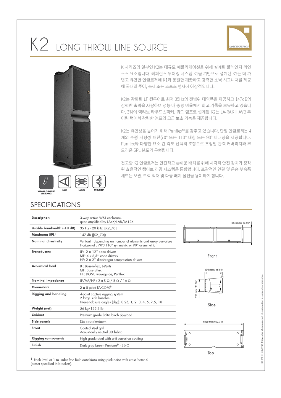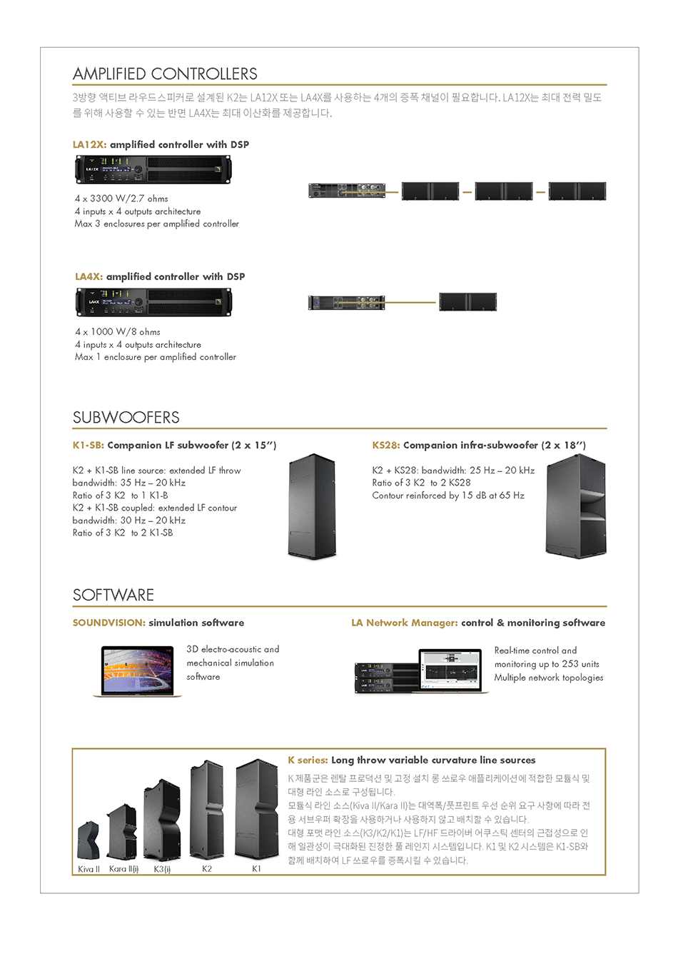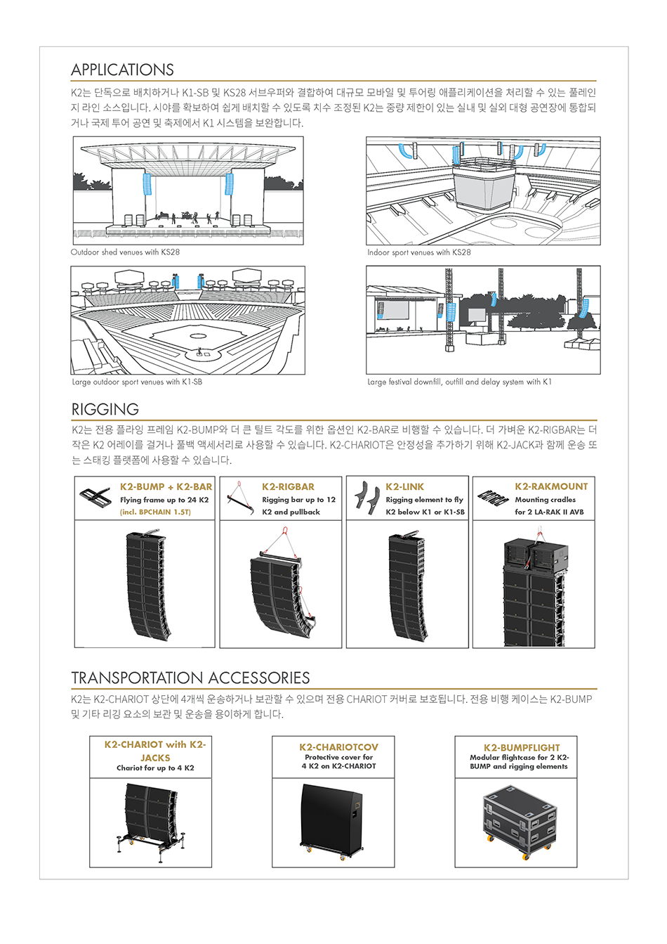 K2는 K1의 깨끗하고 강력한 사운드를 좀 더 가볍고 컴팩트한 포맷으로, 최대한의 가변성을 위해 인클로져 간의 각도를 10°까지 선택할 수 있도록 제공합니다. K2는 K1을 보완하는데 사용할 수도 있고 최대 20,000명의 관객을 동원하는 행사를 부족함 없이 단독 사운드 시스템으로 사용할 수 있습니다.
