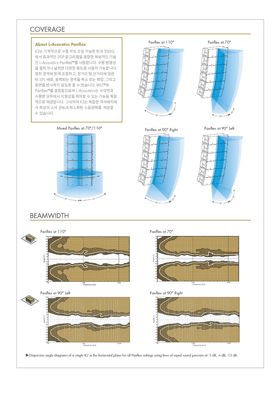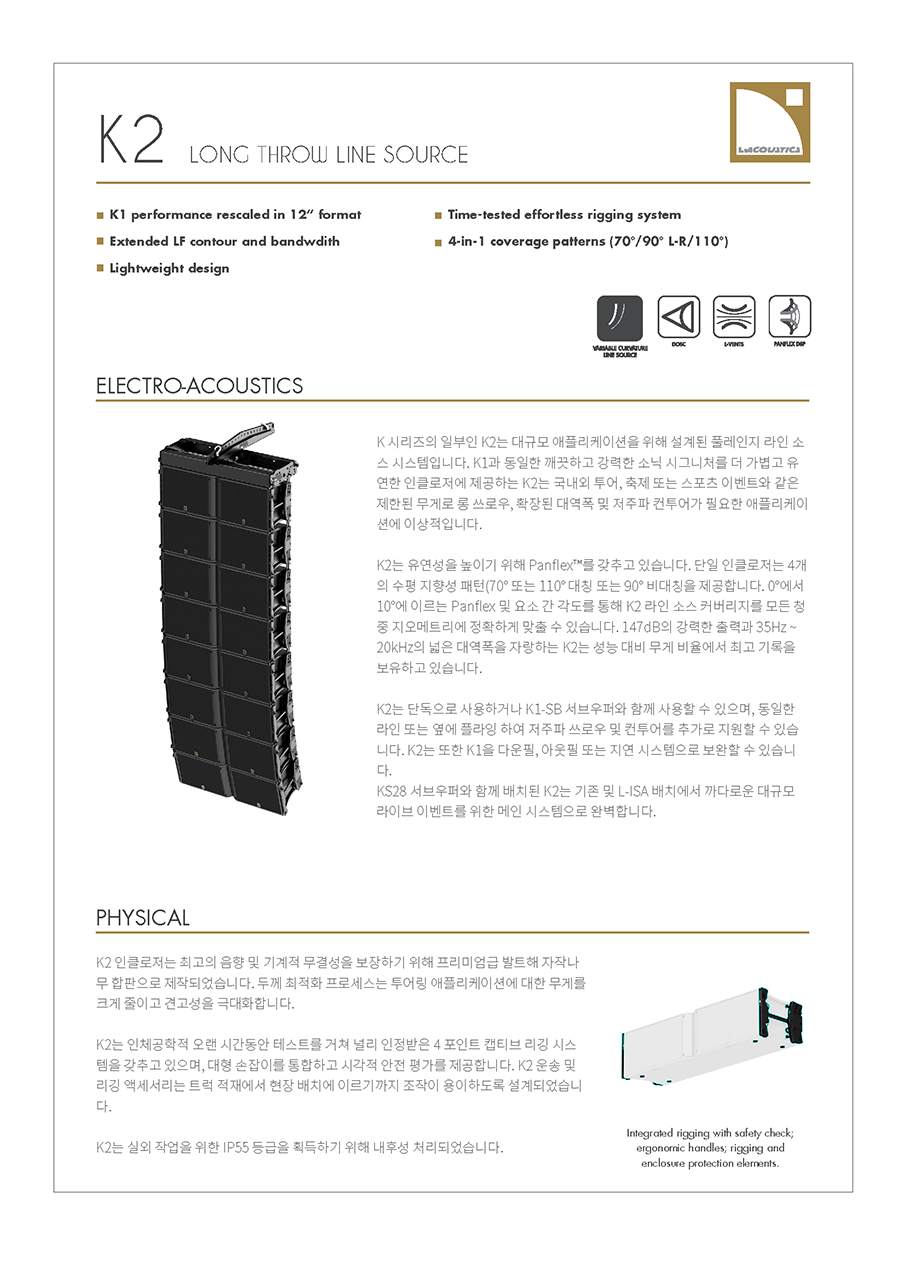K2는 매우 가벼워 매우 힘든 설치 환경 속에서도 운영이 가능하고, 수평 지향각을 조절 가능하게 하는 L-ACOUSTICS 전용의 Panflex를 통해 관객에게만 소리를 전달하여 야외 행사의 열악한 음향 환경과 소음공해 문제를 해결할 수 있습니다.