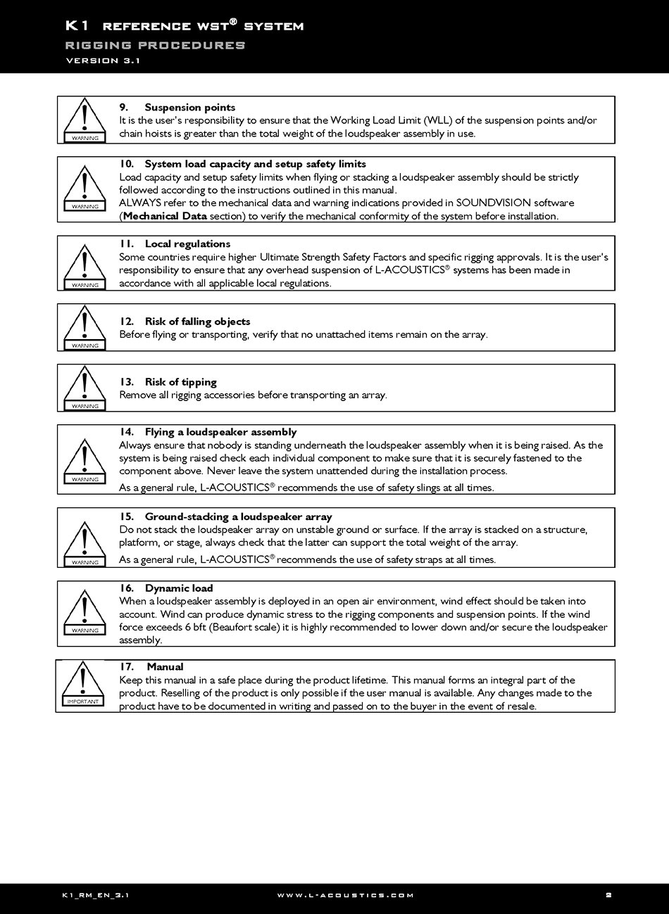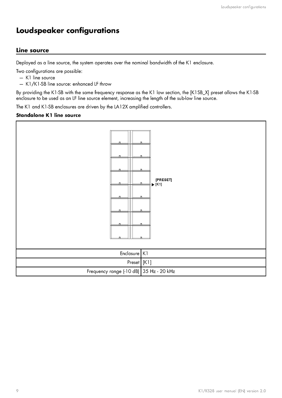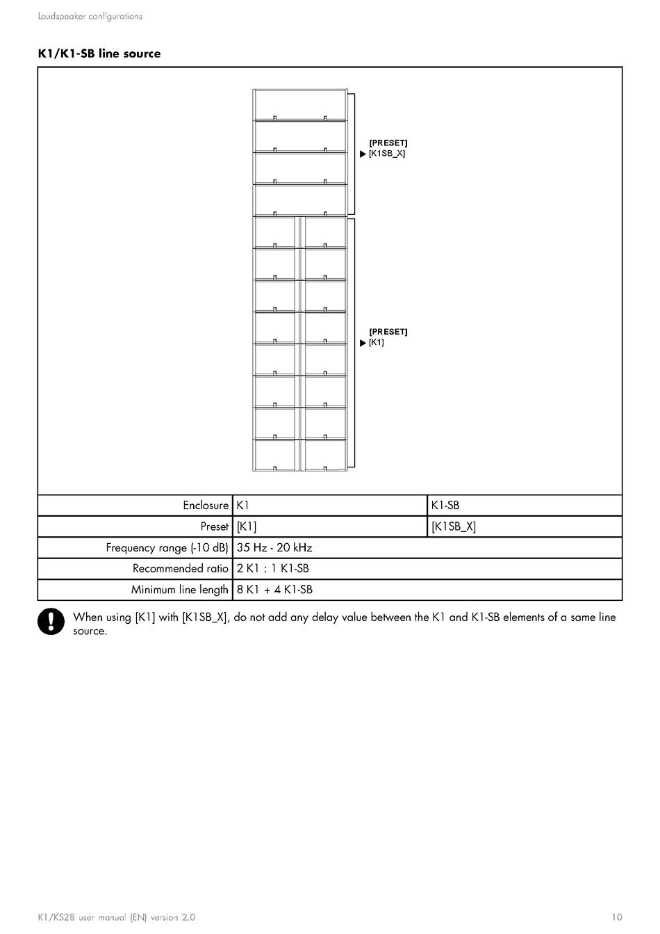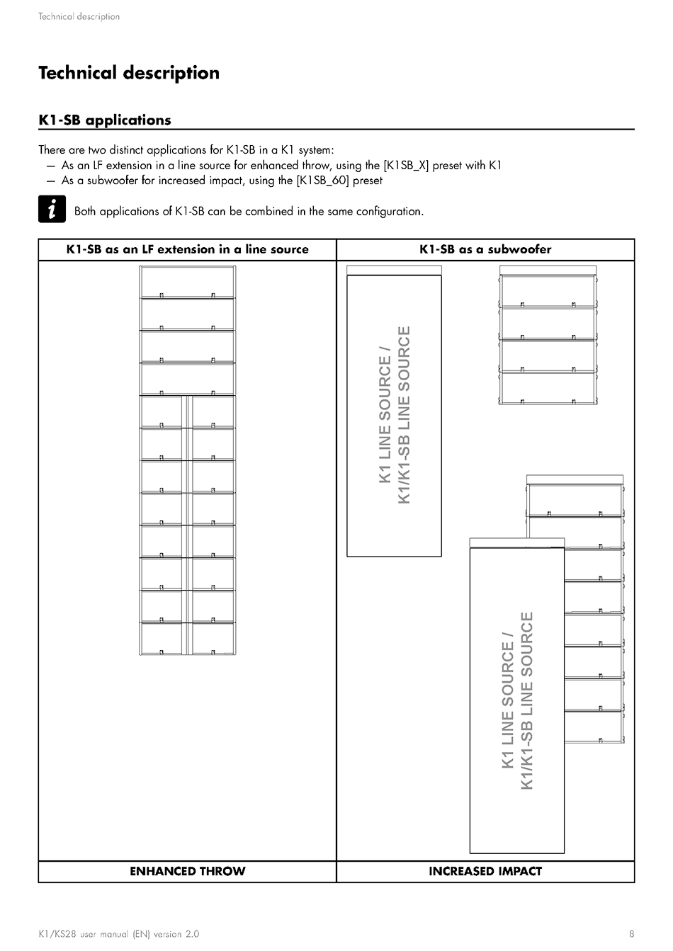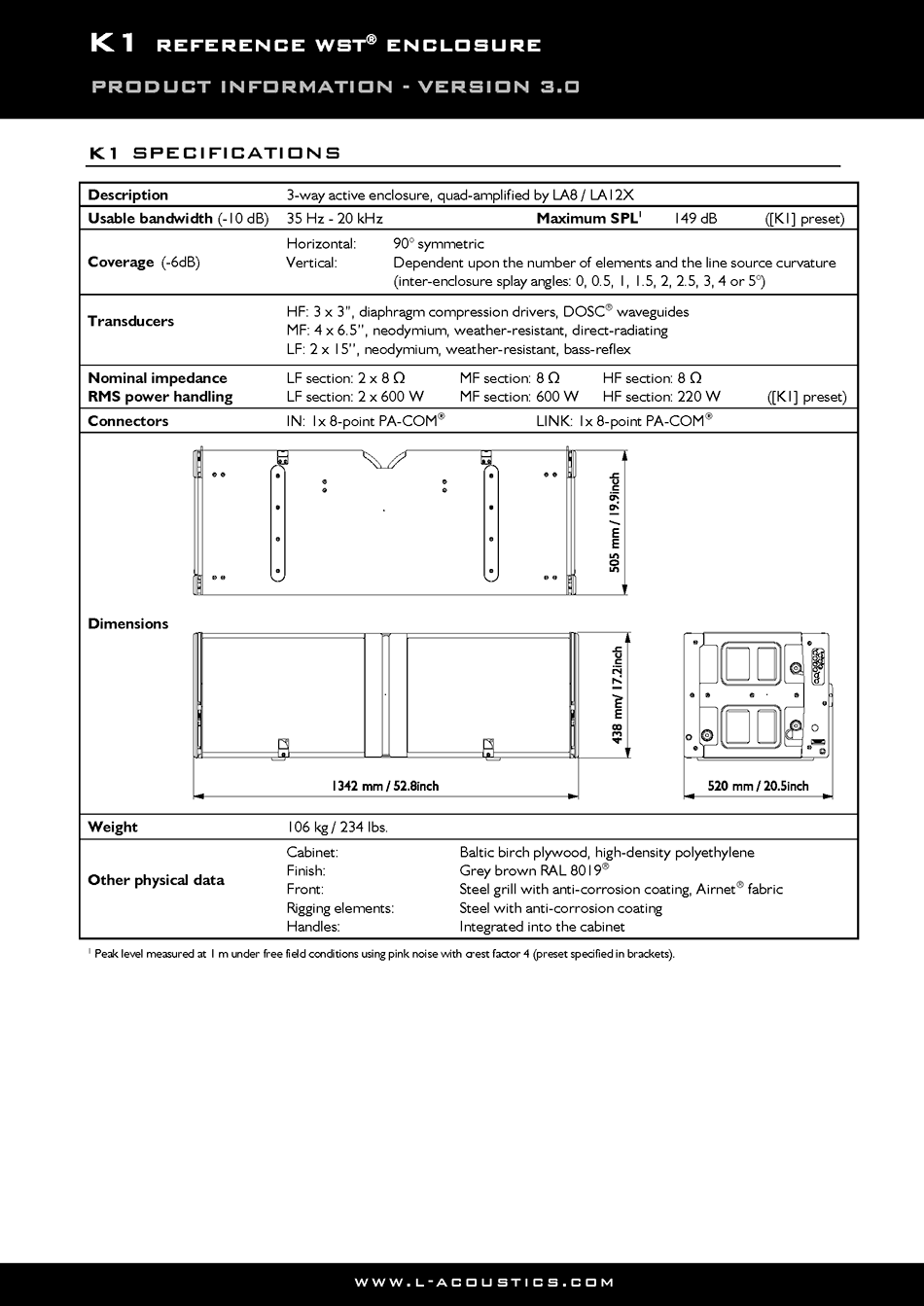 미터 당 SPL 수치로는 비교 대상이 없고 K1-SB와 함께 사용할 시 전례 없는 방향성에 대한 컨트롤을 보여 소음 공해와 야외 세팅에서의 쓰로우 문제 해결의 선두주자 이기도 합니다. 거의 예술수준의 최첨단 리깅 방식을 자랑하는 K1은 정확한 배치와 빠른 설치에 적합합니다.