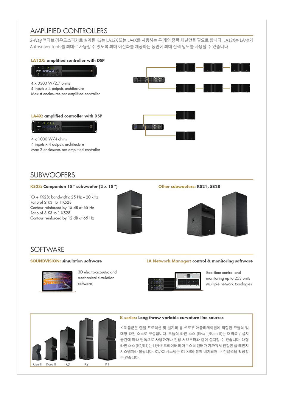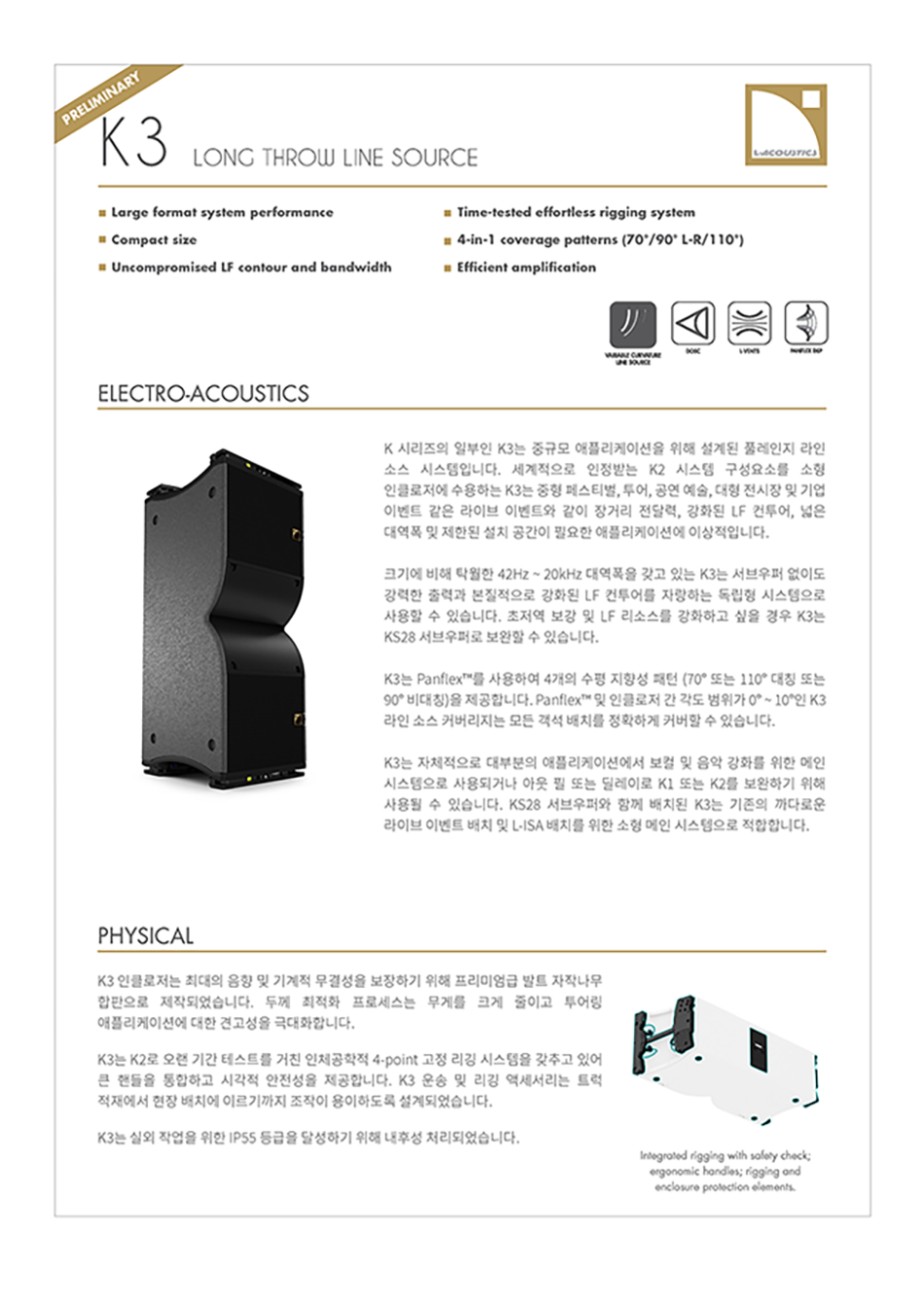 K 시리즈 라인을 완성하는 K3는 1,000명에서 10,000명에 이르는 중간 규모의 이벤트 및 장소에 대한 모든 요구 사항을 충족하는 다목적 라우드스피커입니다. 진정한 풀 레인지 라인소스로 설계된 K3는 12” 트랜스듀서를 통합하여 대형 시스템 성능을 제공하지만 일반적인 10” 컴팩트 사이즈로 구성 됐습니다. 서브우퍼 및 앰프 요구가 감소 된 K3 설치는 빠르고 간단하며 지속 가능하며 경제적입니다.