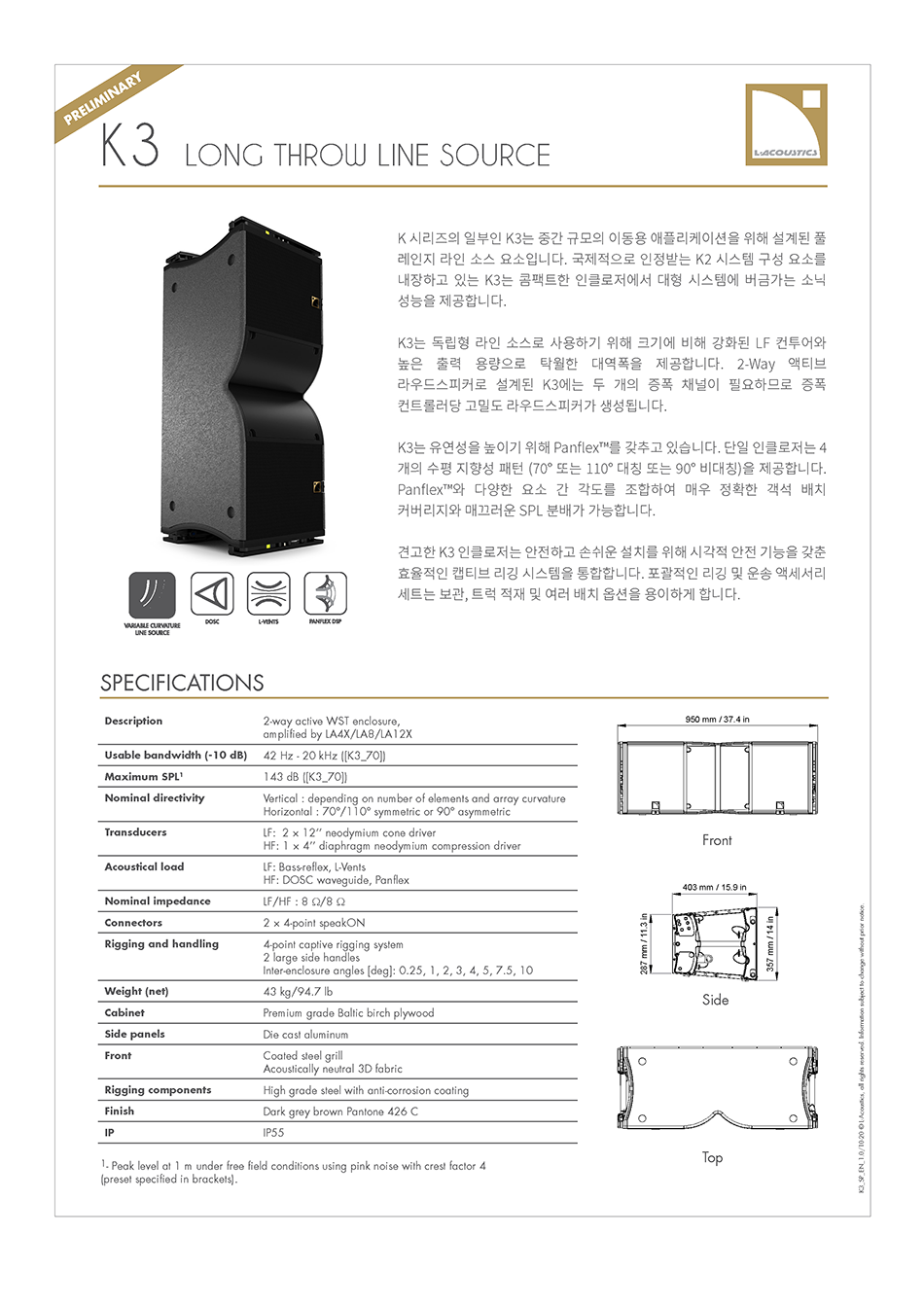 K3 two-way 액티브 엔클로저는 무게 감소를 위한 최적화 된 기계 설계, 강력하고 선형적인 LF 응답을 위한 라미나 벤트, 시간 테스트를 거친 손쉬운 캡티브 리깅을 포함하여 K 시리즈를 라인 어레이 기술의 기준으로 만든 모든 특징을 갖추고 있습니다. 또한 L-Acoustics Panflex™ 기술을 사용하여 4가지 수평 지향성 패턴 (70° 또는 110° 대칭 또는 90° 비대칭)을 선택할 수 있습니다. Panflex 및 0°에서 10° 범위의 인클로저 간 각도로 K3 라인소스 커버리지는 모든 객석 배치에 맞게 정확하게 조정될 수 있습니다.