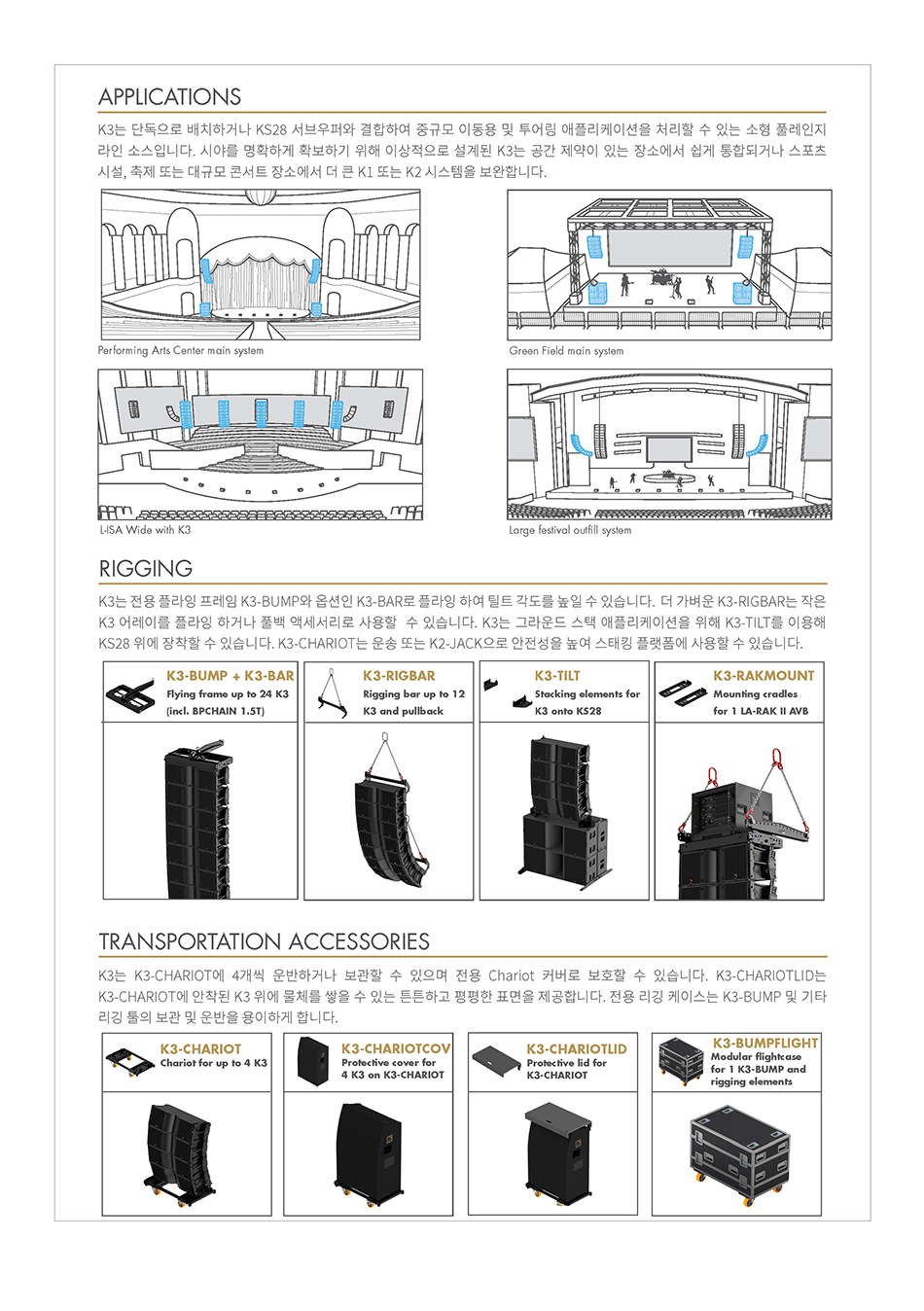 시야를 명확하게 유지하기위한 이상적인 크기인 K3는 공간이 제한된 장소에 쉽게 통합됩니다. 또한 대규모 투어링 이벤트, 축제 및 콘서트를 위해 더 큰 K1 또는 K2 시스템을 보완합니다.