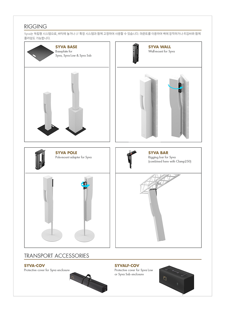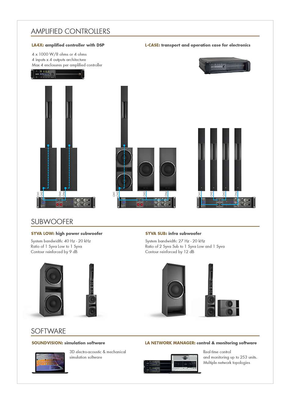SYVA LOW는 두개의 K2 12인치 드라이버가 장착되어 강력하고 펀치감 있는 사운드를 만드는 역할을 합니다. 특히 L-ACOUSTICS의 서브우퍼들은 확장 대역폭을 필요로 하는 사운드 시스템을 보완하는 것이 특징입니다. 모든 서브 우퍼들은 높은 진폭 드라이버, 초저역 진동벽, 측면 이 벌어진 L-vents를 사용하여 포트 소음은 극단적 으로 축소되고 그 에너지와 출력은 최대화되었으며 성능 또한 최고 수준입니다. L-ACOUSTICS의 서브우퍼는 다양한 모드로 사용 가능하여 어떠한 렌탈 혹은 고정 설치 애플리케이션 에도 적절합니다. 엔지니어들과 사운드 디자이너들 은 표준 배열이나 카디오이드 구성 중 선택하여 특정 디자인에 맞춰 다양한 대칭 혹은 비대칭 지향성 패턴 을 만들어낼 수 있습니다.