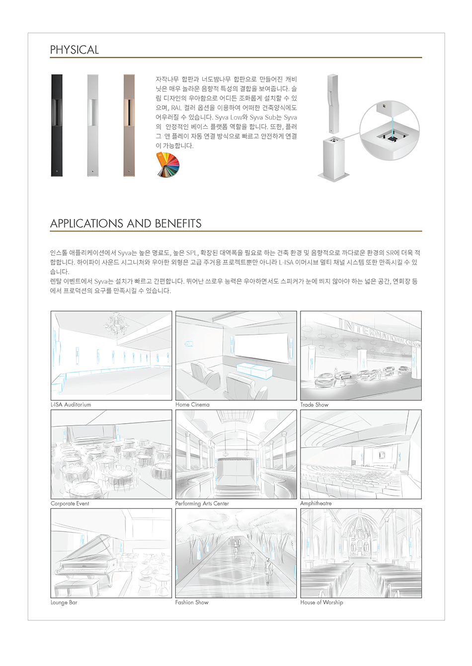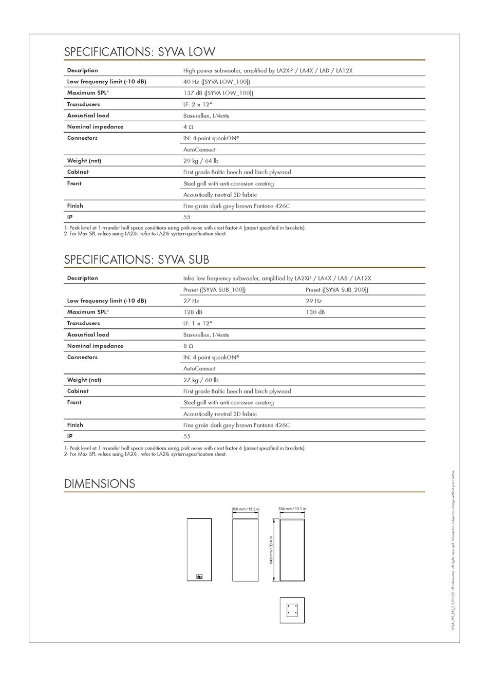 SYVA SUB는 SYVA 전용으로 개발된 제품입니다. L-ACOUSTICS 의 서브우퍼들은 확장 대역폭을 필요로하는 사운드 시스템을 보완합니다. 모든 서브우퍼들은 높은 진폭 드라이버, 초저역 진동벽, 측면이 벌어진 L-vents를 사용하여 포트 소음은 극단적으로 축소되고 그 에너지와 출력은 최대화 되었으며 성능 또한 최고 수준입니다. L-ACOUSTICS 의 서브우퍼는 다양한 모드로 사용 가능하여 어떠한 렌탈 혹은 고정 설치 애플리케이션에도 적절합니다. 엔지니어들과 사운드 디자이너들은 표준 배열 이나 카디 오이드 구성 중 선택하여 특정 디자인에 맞춰 다양한 대칭 혹은 비대칭 지향성 패턴을 만들어낼 수 있습니다.