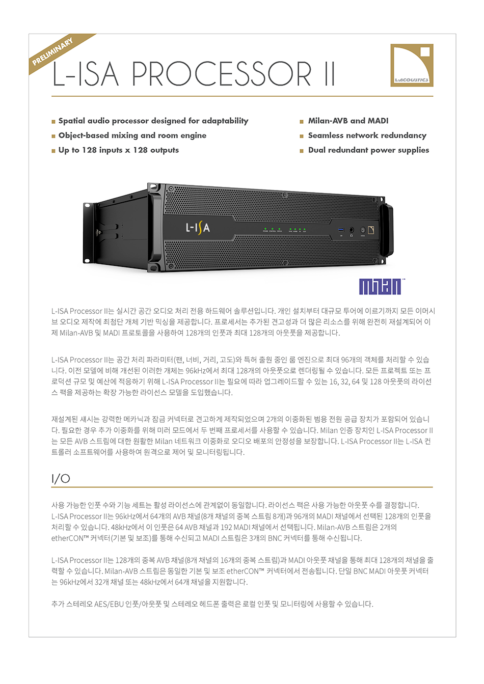 L-ISA Processor II는 실시간 공간 오디오 처리 전용 하드웨어 솔루션입니다.
