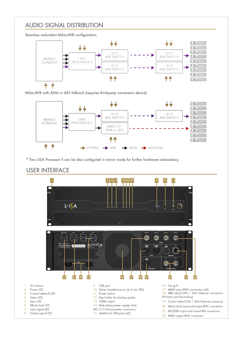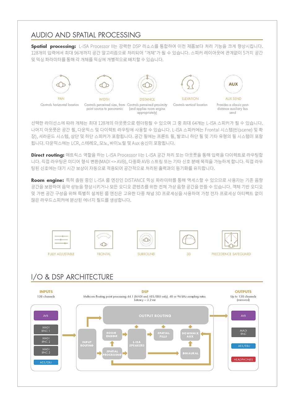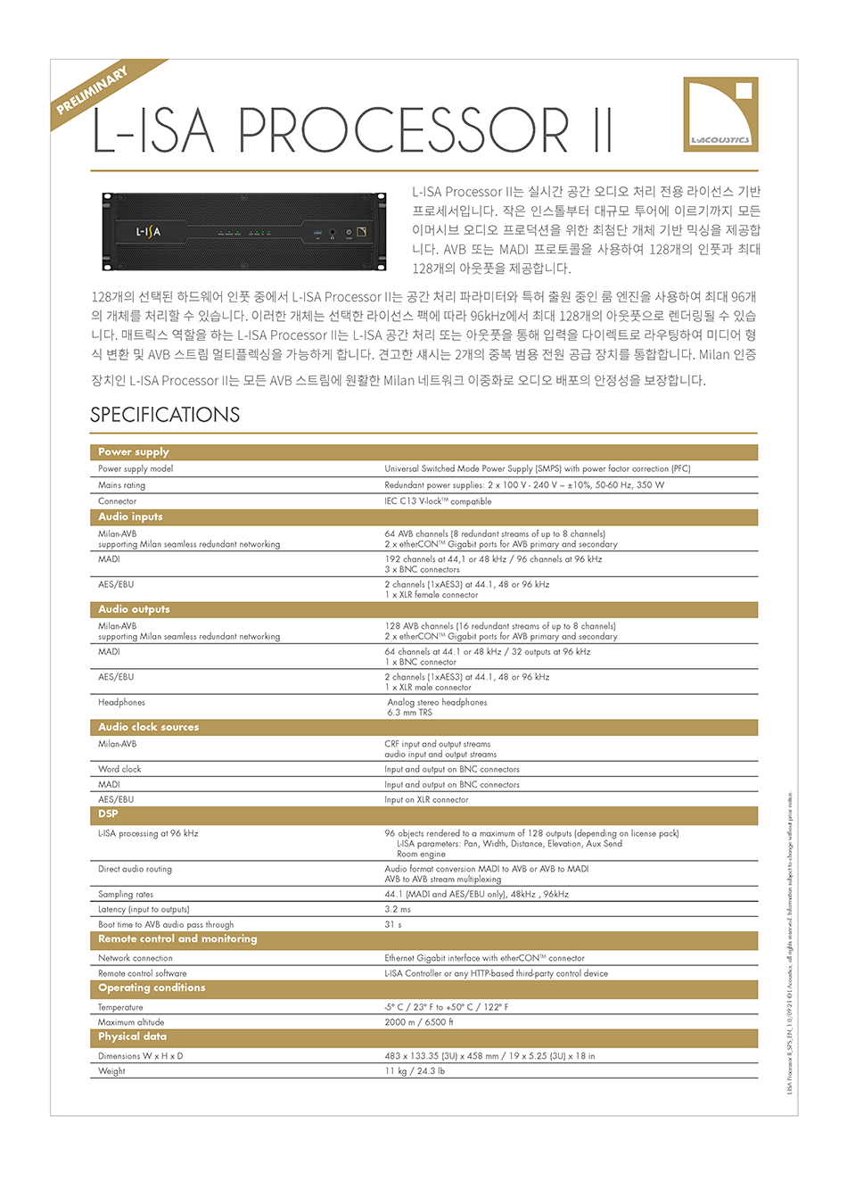L-ISA Processor II는 공간 처리 파라미터(팬, 너비, 거리, 고도)와 특허 출원 중인 룸 엔진을 사용하여 최대 96개의 오브젝트를 처리할 수 있습니다. 이전 모델에 비해 개선된 이러한 오브젝트는 96kHz에서 최대 128개의 출력으로 렌더링될 수 있습니다.