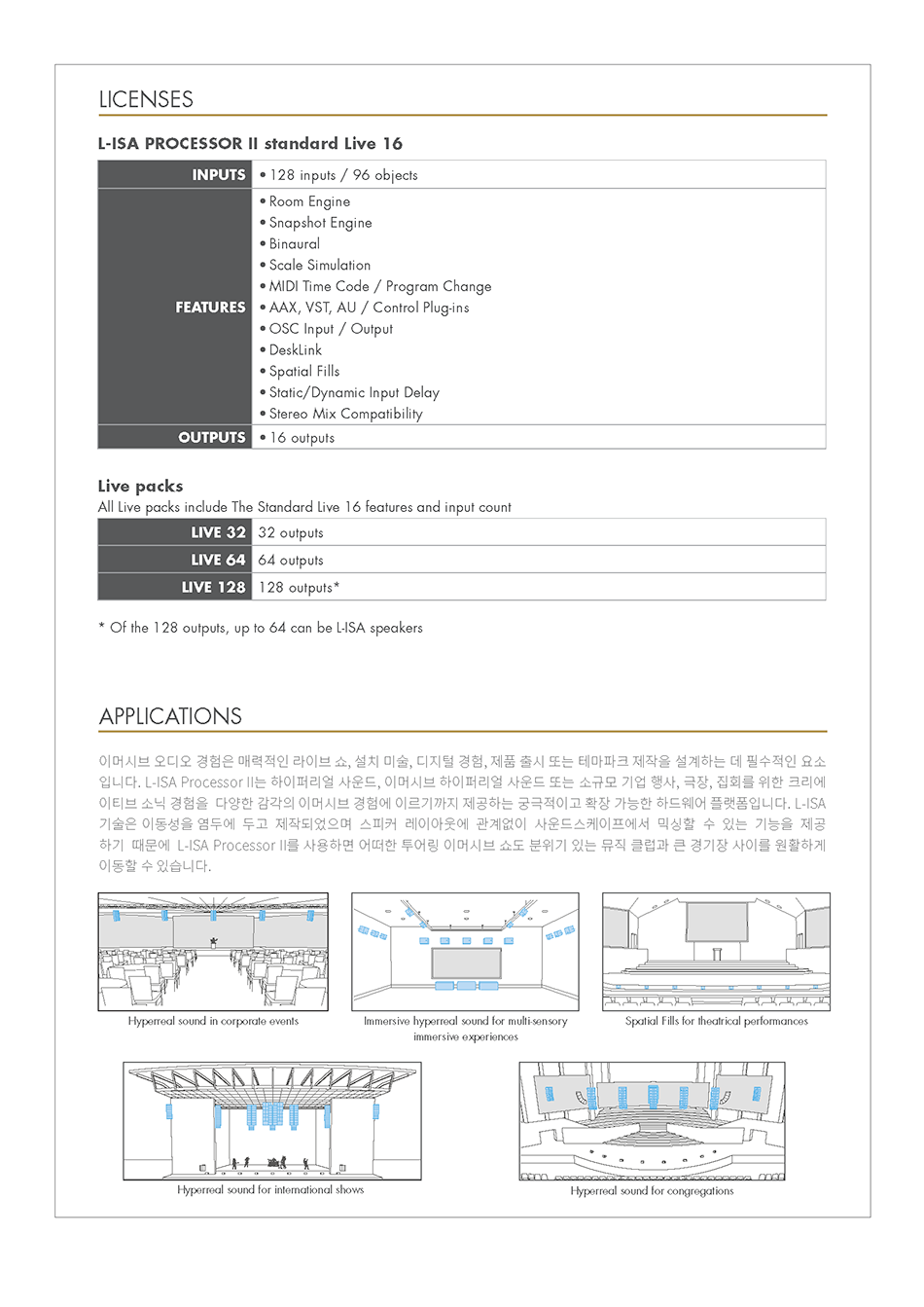 L-ISA Processor II는 모든 프로젝트 또는 생산 규모와 예산에 맞추기 위해 필요에 따라 업그레이드할 수 있는 16, 32, 64, 128 출력의 라이선스 팩을 제공하는 확장 가능한 라이선스 모델을 도입했습니다.