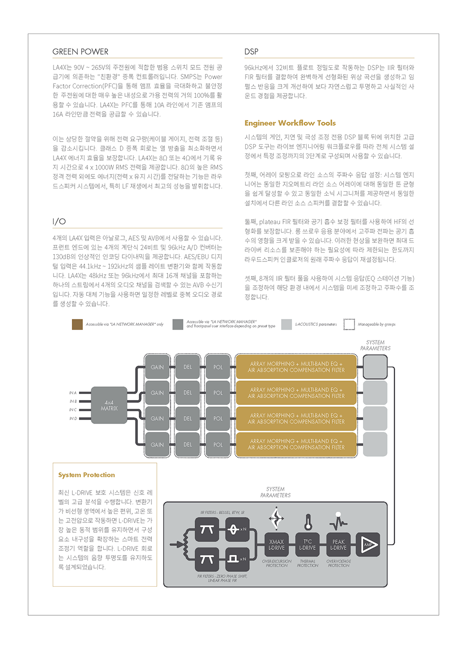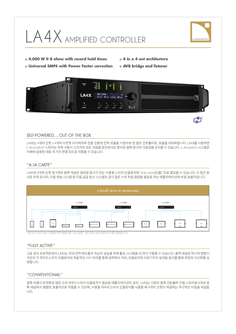 LA4X는 4출력, 4입력의 구조를 바탕으로 전용의 그린 전원 모듈을 제공하면서, 효율 극대성을 전달하는 앰프 컨트롤러입니다. LA4X로 L-Acoustics 스피커는 자체 전원이 공급되는 스피커의 모든 이점을 가지면서 분리된 앰프 방식의 다양성을 유지할 수 있습니다.