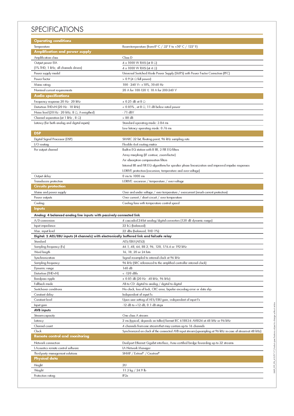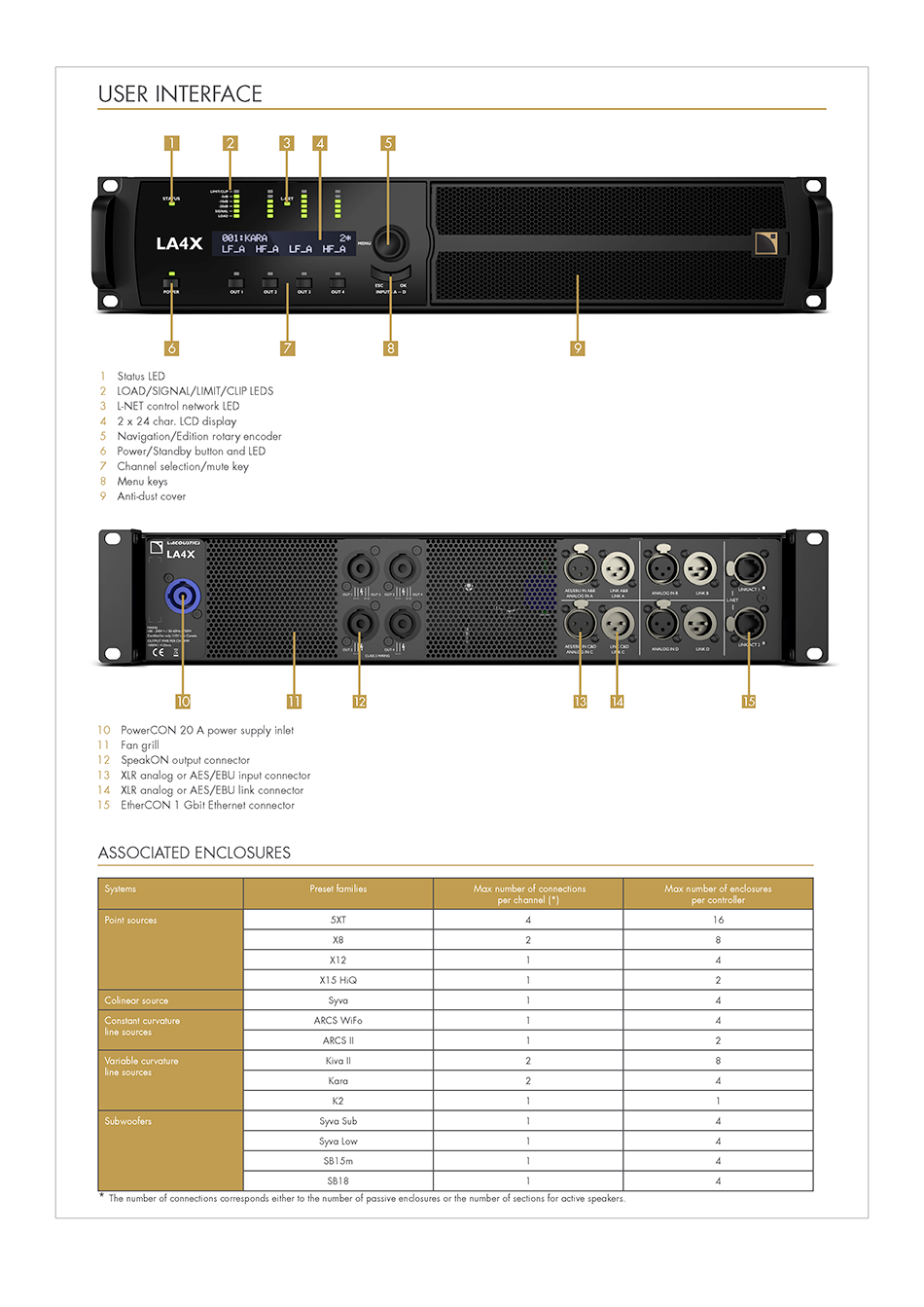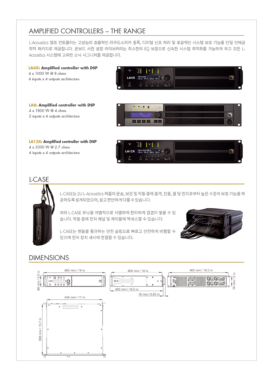 L-Acoustics의 앰프 컨트롤러는 단일의 인간 공학적 패키지로 고성능 및 고효율의 라우드 스피커 앰플리케이션, 디지털 시그널 프로세싱, 완전한 시스템 보호 기능을 제공합니다. 온보드 프리셋 라이브러리는 최소한의 EQ 보정으로 신속한 시스템 최적화가 가능하고 모든 L-Acoustics 시스템에 특별한 시그니쳐 사운드를 전달합니다.