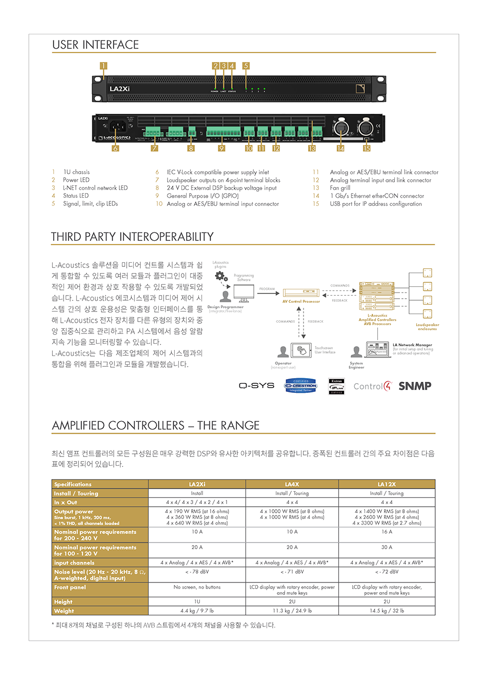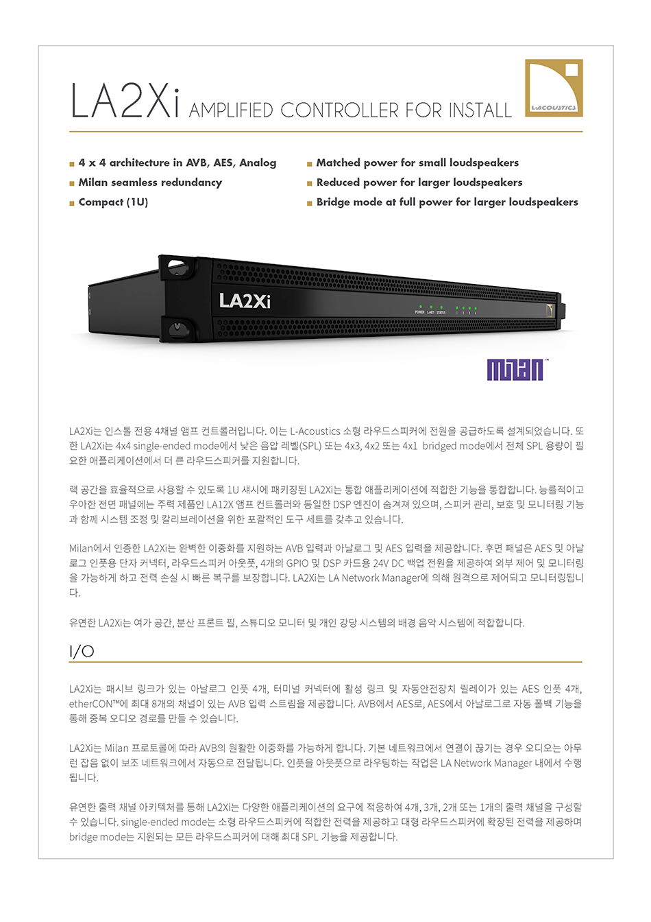 유선형의 전면 패널 내부에는 LA12X 앰프과 동일한 DSP 엔진이 장착되어 있어 스피커 컨트롤, 보호 및 모니터링 뿐 아니라 시스템 조정과 칼리브레이션을 위한 기능을 포함하고 있습니다. LA2Xi는 Milan 인증제품으로써 AES와 아날로그 입력 외에도 완벽한 네트워크 이중화로 AVB를 지원하여 최고의 안정성을 보장합니다. 통합 애플리케이션을 위해 커스터마이징된 LA2Xi 는 모든 터미널 블록에서 DSP 카드에 사용자가 지정하여 할당할 수 있는 4개의 GPIO 및 24V DC 백업 전원을 제공하여 외부 제어 및 모니터링을 가능하게 하고 전력 손실 시 빠른 복구가 가능합니다.
