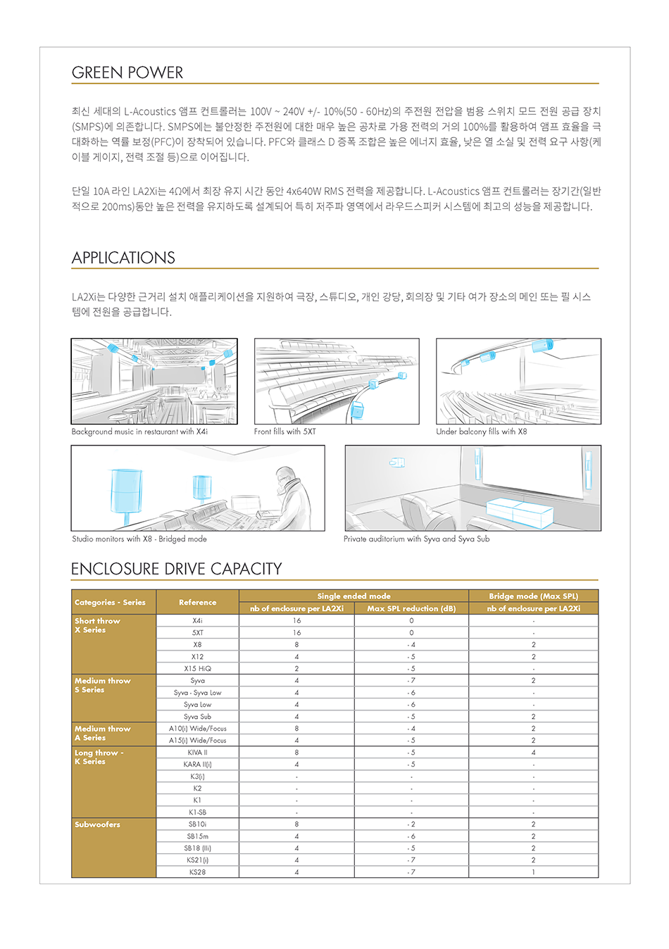 최적화된 랙 공간을 위해 1U 사이즈로 디자인되었으며 레저시설, 공연장 Fill 시스템, 스튜디오모니터 및 프라이빗 오디토리움 등의 BGM 전원 공급을 위해 이상적입니다.