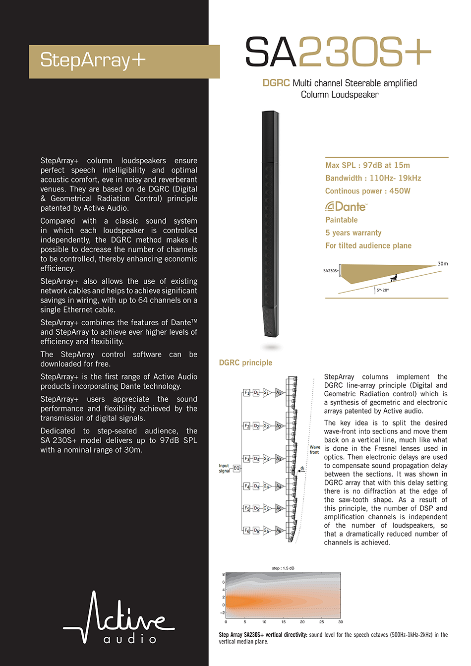 SA230S+는 중·대규모 고잔향 공간의 경사 좌석(Tilted Audience) 구역을 위한 인스톨레이션용 디지털 빔 스티어링 컬럼 스피커입니다.