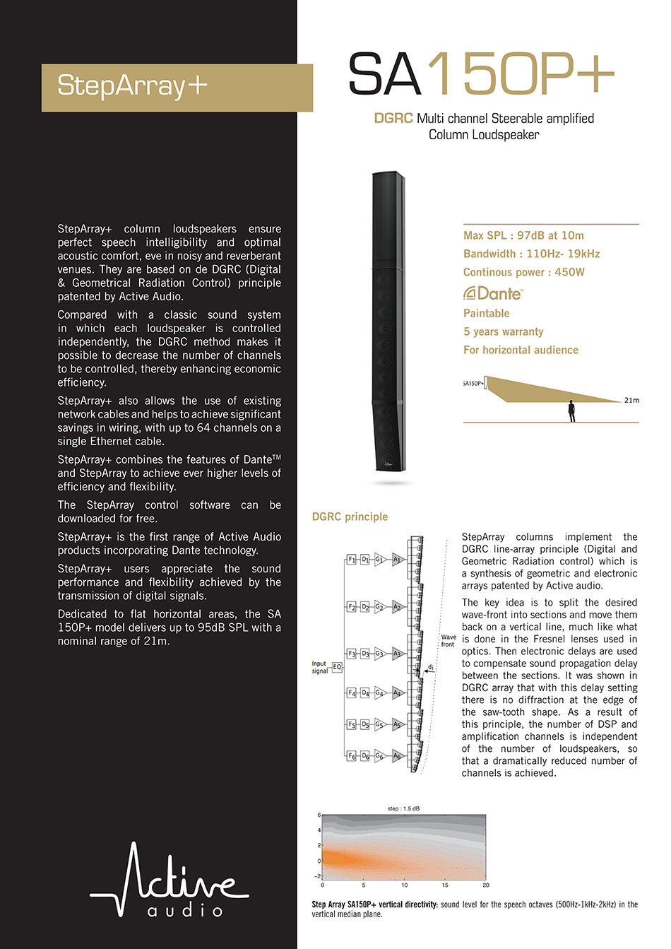 SA150P+는 중·소규모 고잔향 공간의 평면 좌석 구역을 위한 인스톨레이션용 디지털 빔 스티어링 컬럼 스피커입니다.