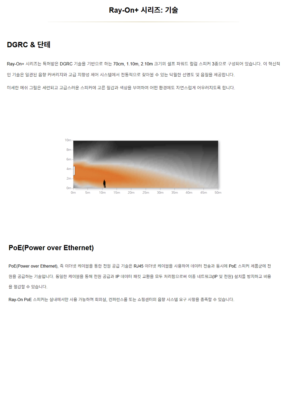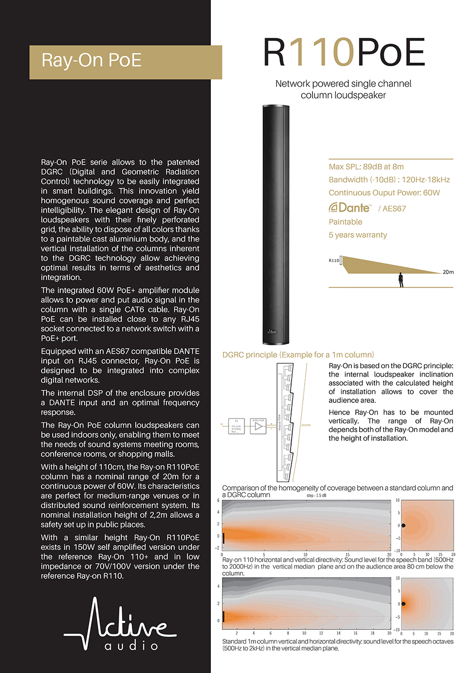 R110 PoE는 수직 설치형 110cm 액티브 컬럼으로 60W PoE+ 앰프를 내장하고 있습니다.